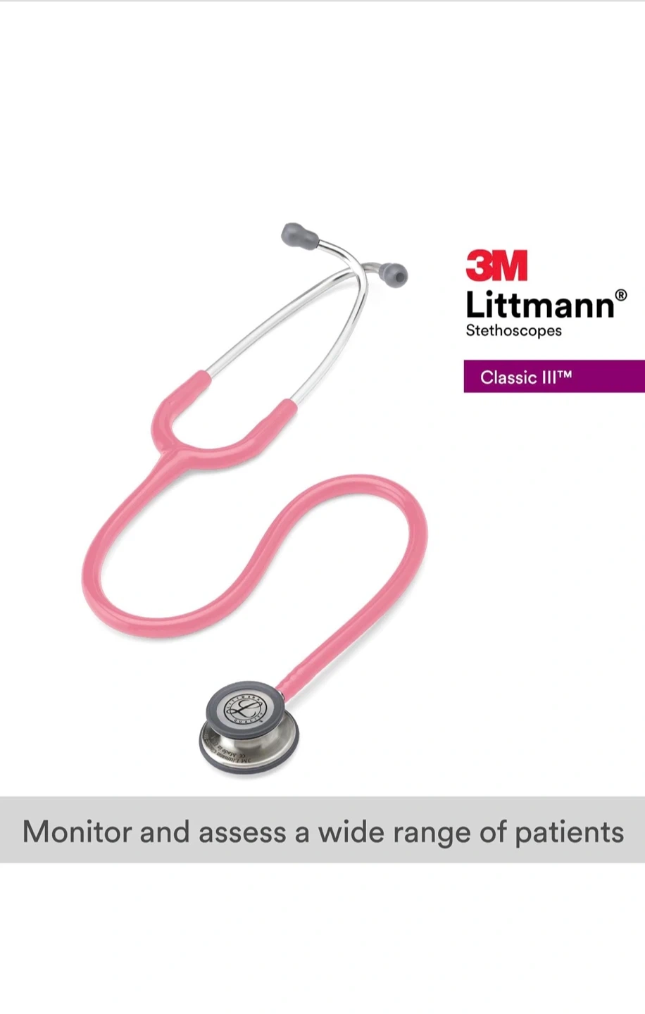 Open box 3M Littmann Classic III stethoscope in pearl pink. It's double-sided with a pediatric side measuring 1.4"/3.4cm and an adult side measuring 1.7"/4.3cm. This stethoscope is designed for monitoring and assessing a wide range of patients.