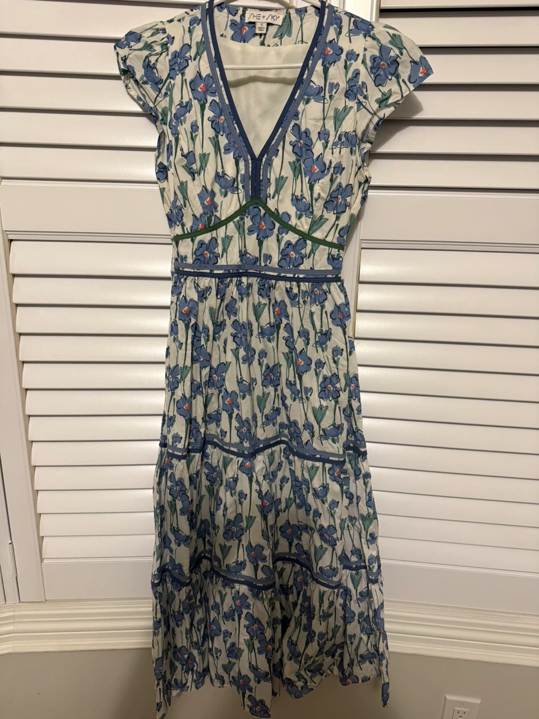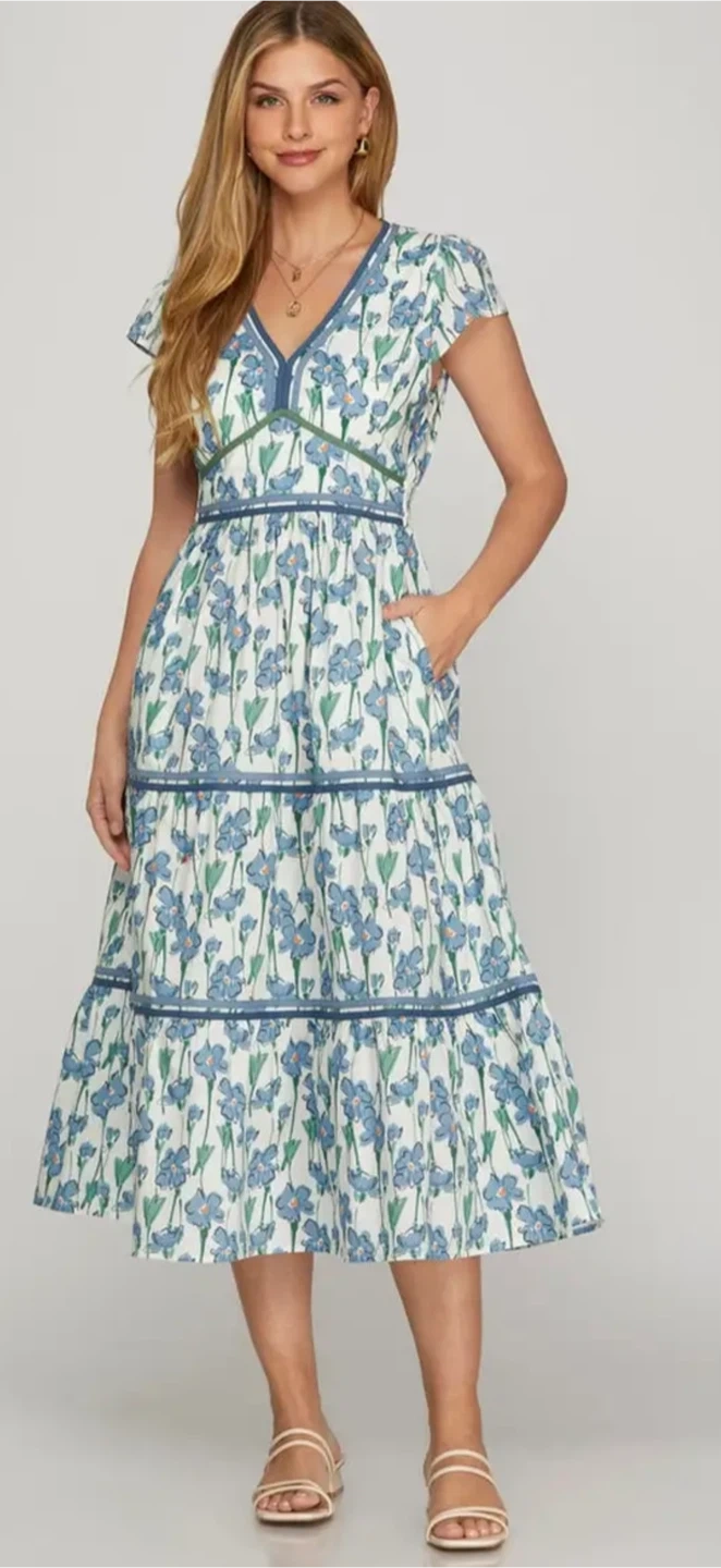 This She + Sky dress features a lovely floral print and a tiered design. It has a V-neck and short sleeves, perfect for a casual day out. The dress is made of a comfortable material and has a flattering silhouette!