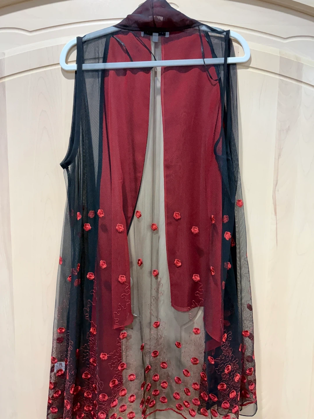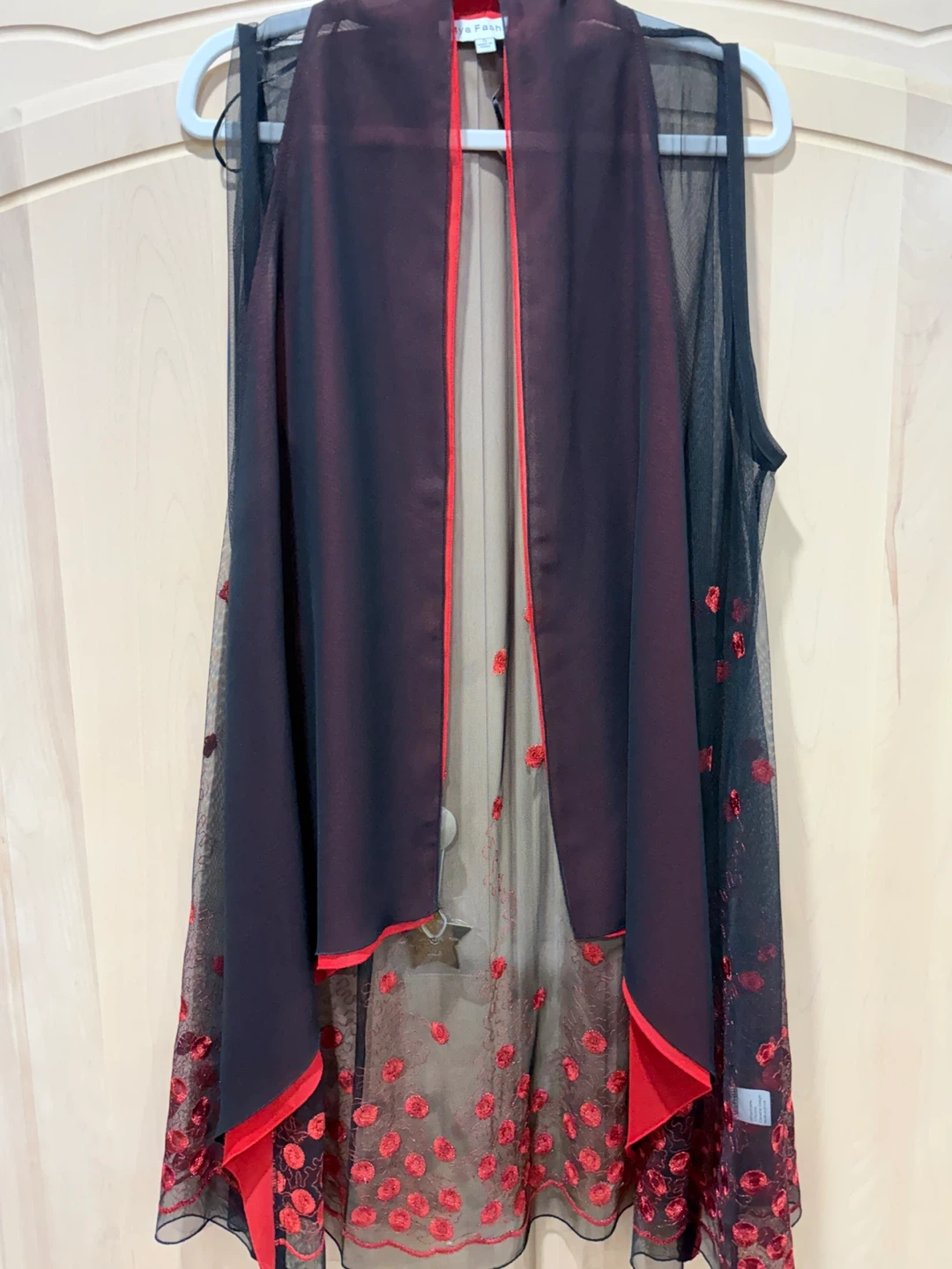 1000+Selling a beautiful sheer black vest with red floral detailing! It's perfect for layering and adding a touch of elegance to any outfit. The red trim adds a pop of colour and complements the delicate floral embroidery