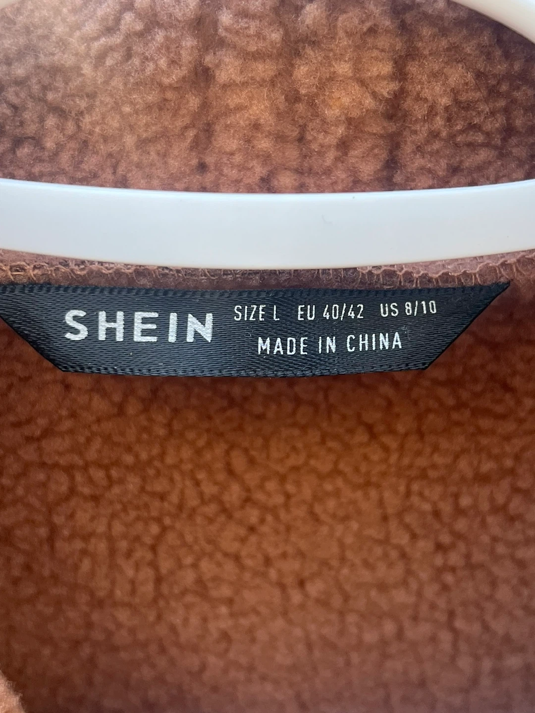Cozy up in this stylish Shein coat! It's a lovely brown colour with a soft sherpa collar and faux suede material. The coat is a size Large (US 8/10, EU 40/42). Perfect for adding a touch of warmth and style to your wardrobe!