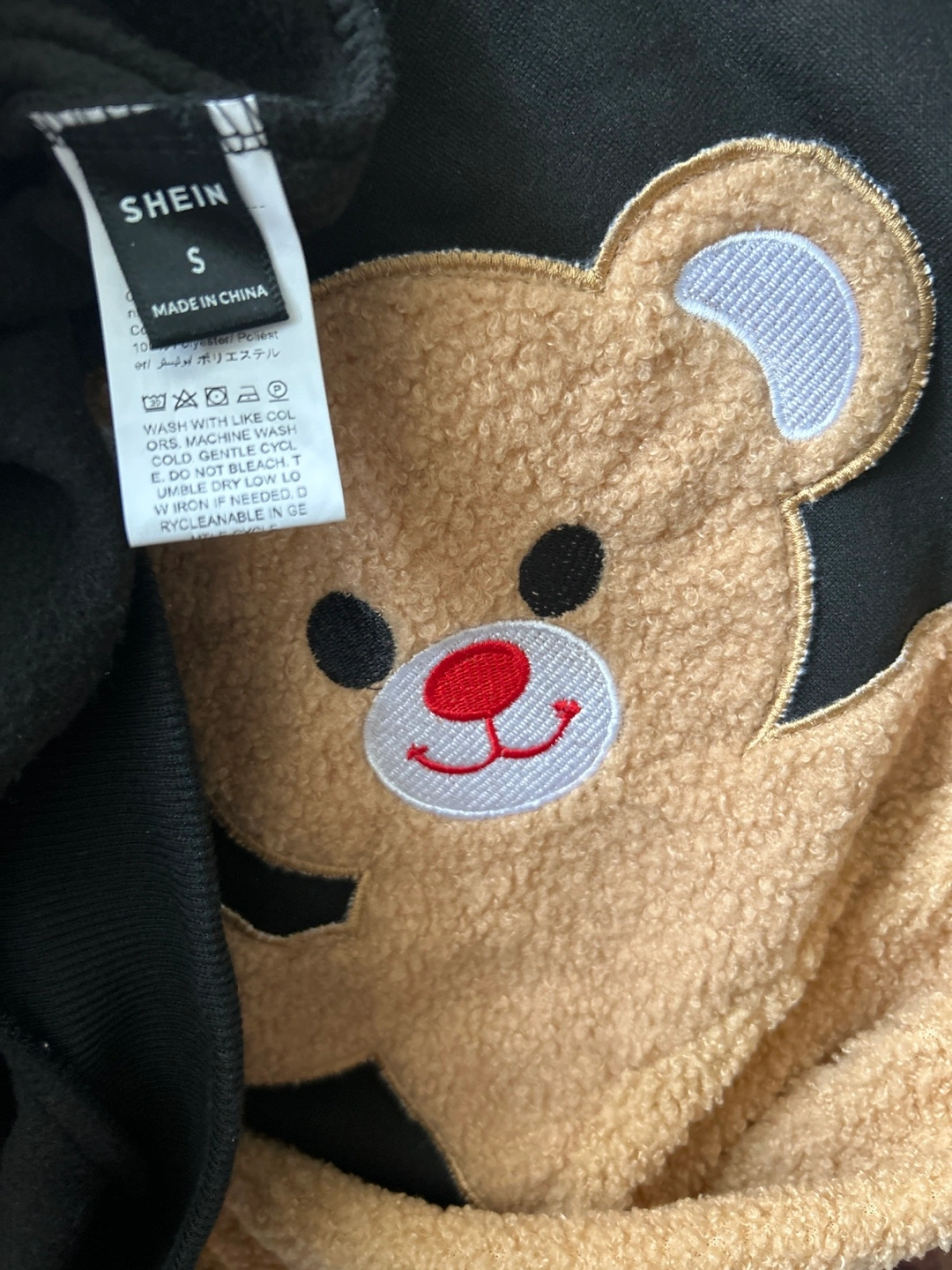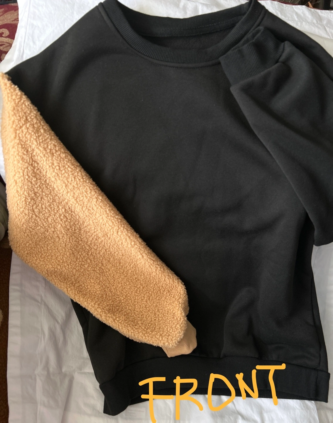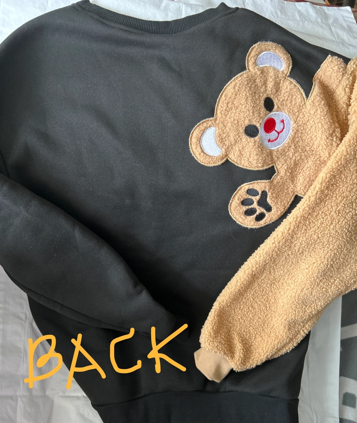 Black sweatshirt with tan sherpa sleeves. Features a cute embroidered teddy bear on the back. Clean and no fabric pilling. Smoke/Pet free home. Cash/Pick up only
