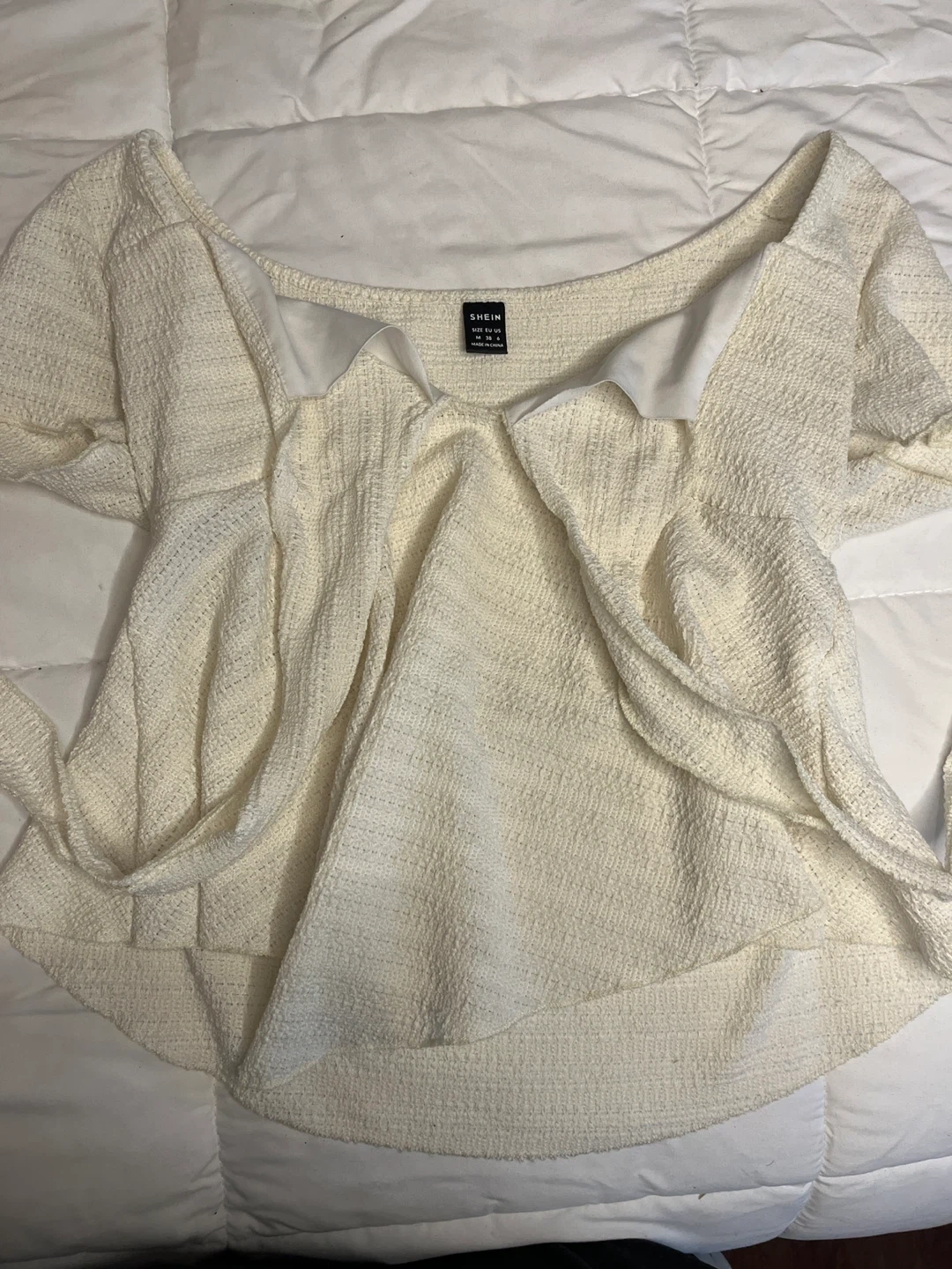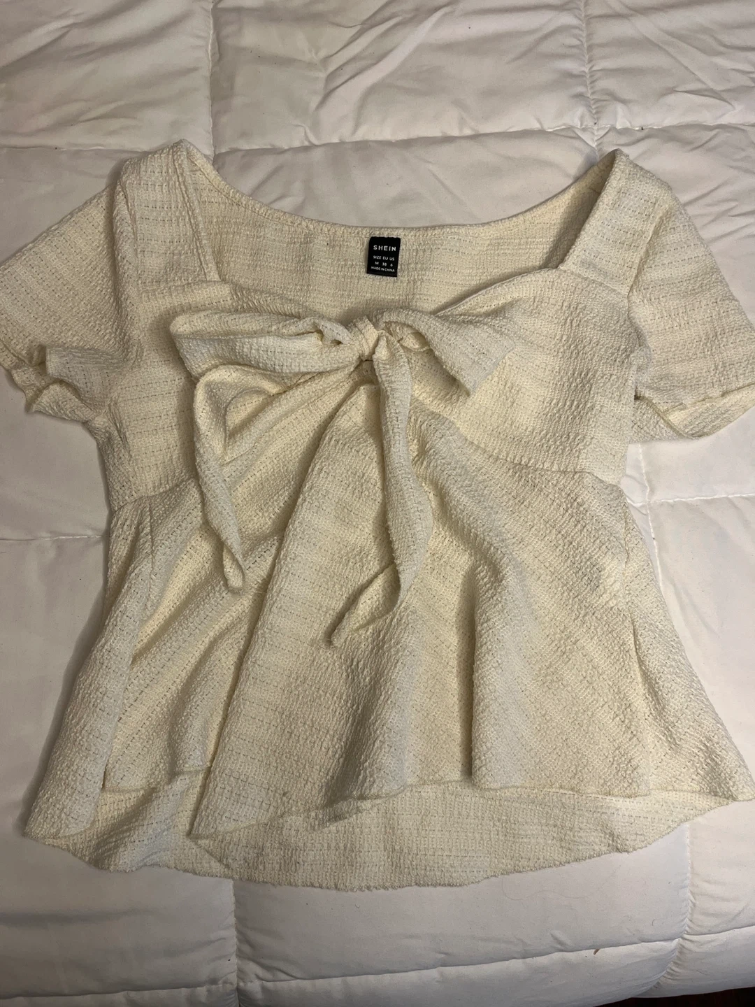 65A cute white blouse from Shein! It features a bow detail and is a size medium. Perfect for a casual or dressy look