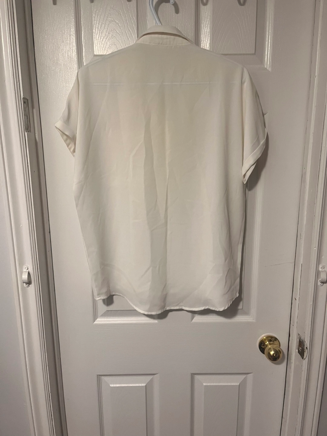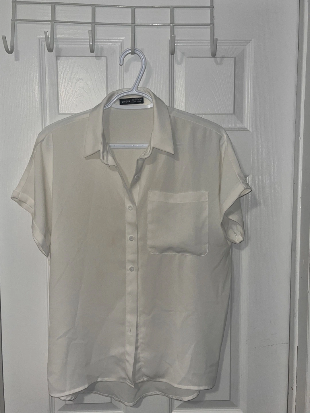 10A lovely SHEIN white button-up shirt. It's a stylish and versatile piece that can be dressed up or down. Perfect for any occasion!