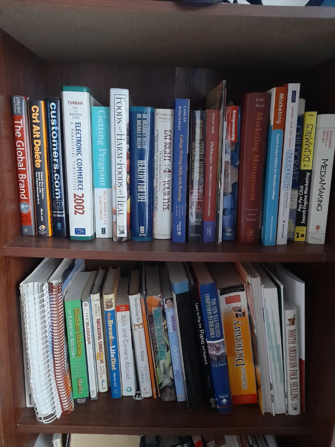 10I'm selling a collection of books from my bookshelf. There's a variety of topics, including marketing, entrepreneurship, and health. Perfect for anyone looking to expand their knowledge or find some new reads! Some titles include 'Marketing Management', 'Electronic Commerce 2002', and 'Healthy for Life'