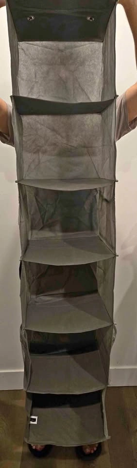 60Move out sale. In very good condition, barely used. Has 6 shelves and 2 side pockets on each side. Has steel hooks to hang the organizer in your wardrobe space. Colour - grey
