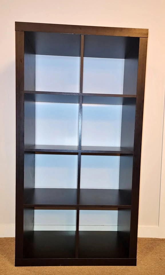 33Pick-up at 3565 Wesbrook Mall - UBC. Assembled KALLAX shelf unit in black‑brown finish with 8 square compartments each. Simple, clean‑lined design for books, decor, vinyl, or basket storage. Can stand vertically or horizontally and pairs with inserts for custom organization. Surfaces are smooth with rounded edges; durable finish in paper foil over particle and fibreboard. Each shelf supports up to 13 kg.