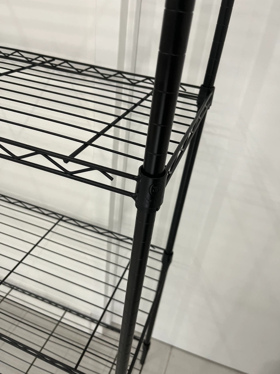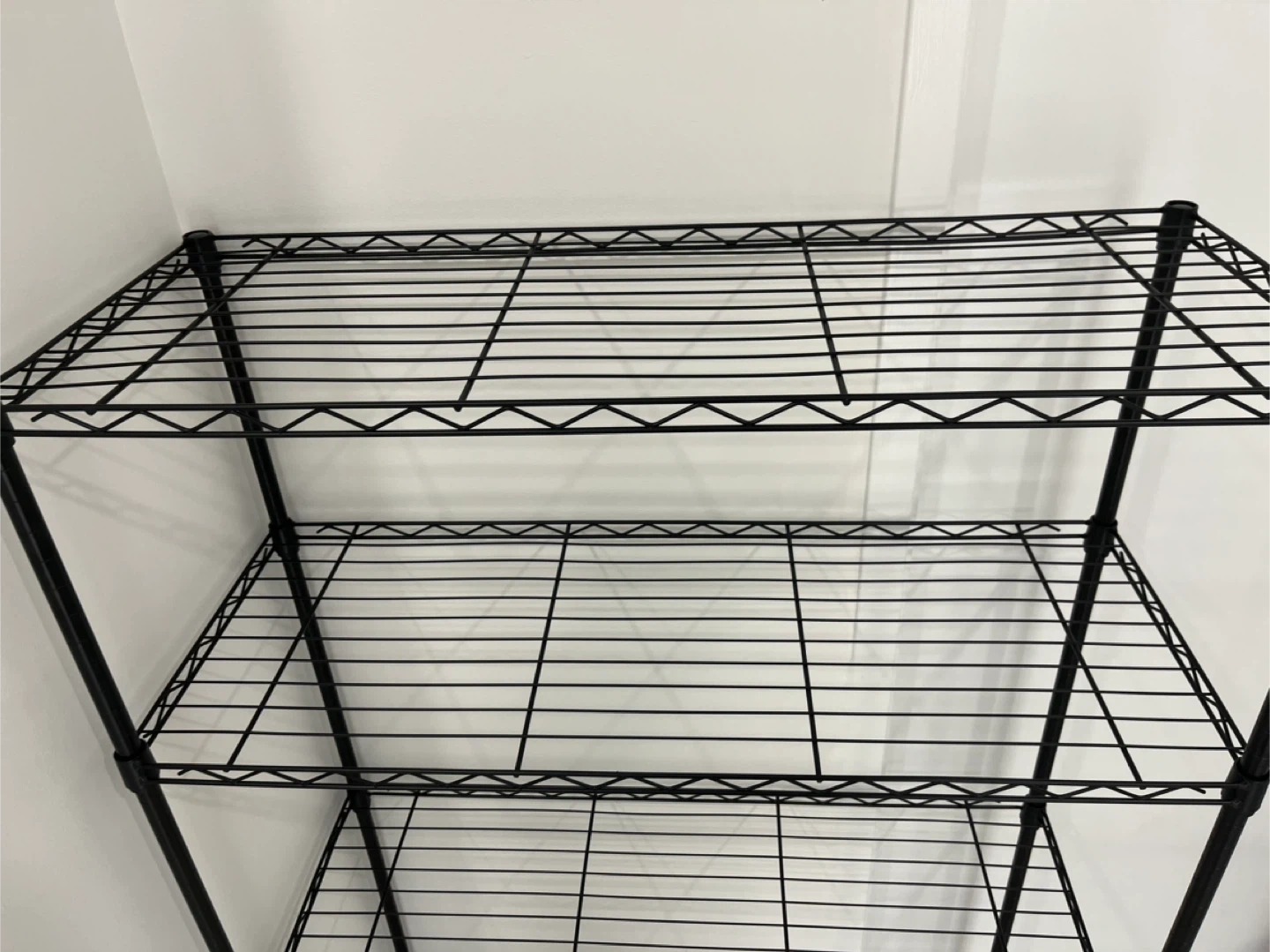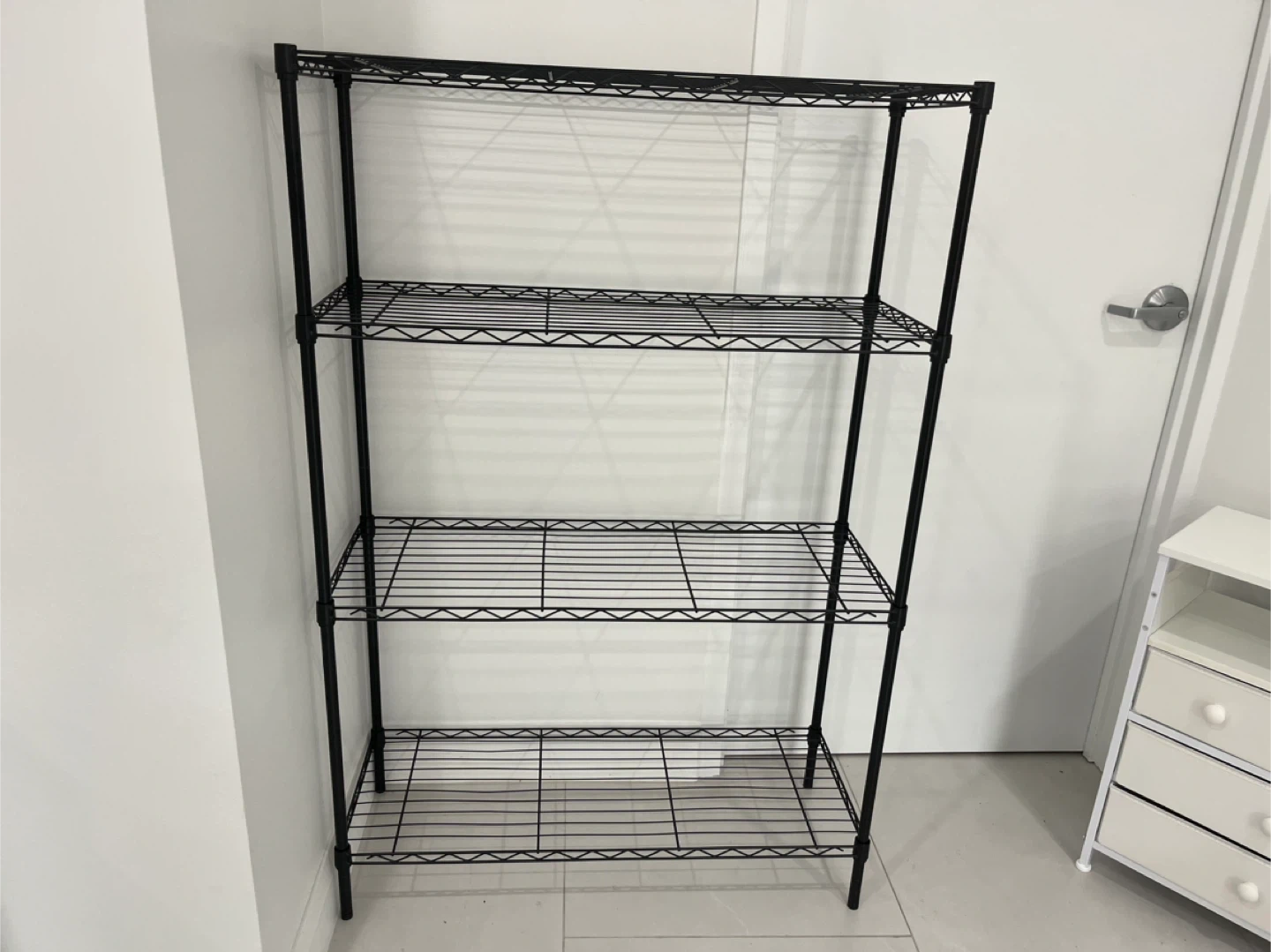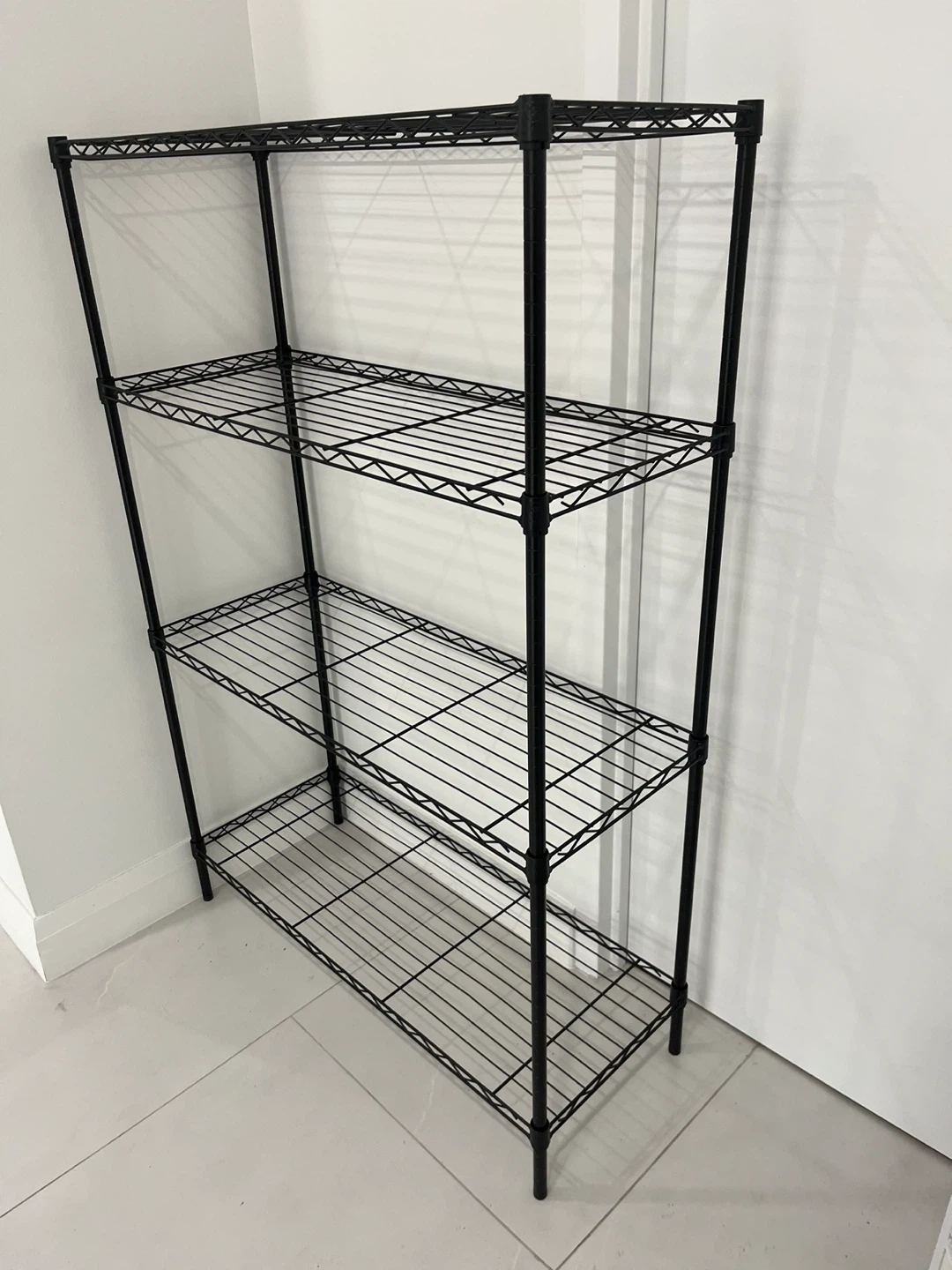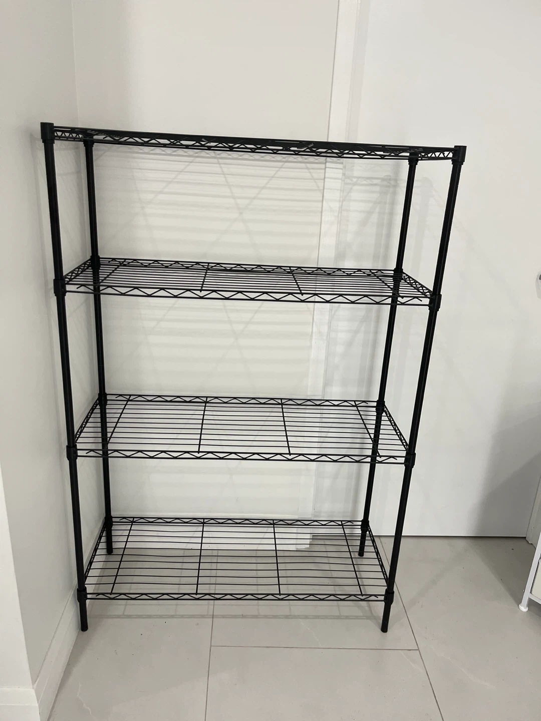 Organize your space with this sturdy black metal shelving unit, perfect for any room needing extra storage. but it is still in good condition and ready to hold your items. Its four shelves provide ample space for books, decorations, or storage bins. Here are its specifications: * Colour: Black * Number of Shelves: 4 * Condition: brand new (it is in the box) L x W x H :90 x 35 x 136.5cm