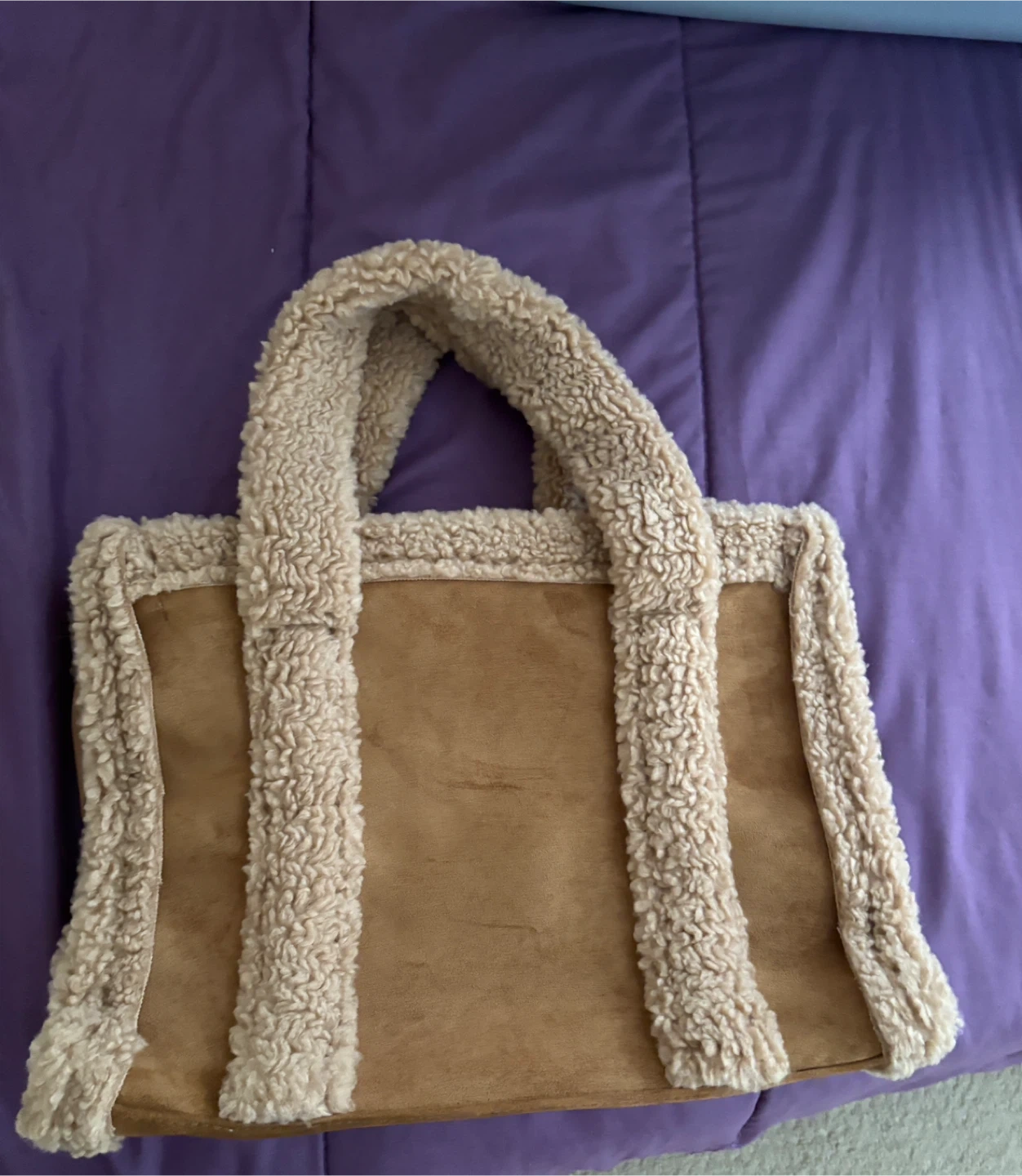 12Selling a tote bag with a cozy sherpa trim! It's a stylish and practical bag, perfect for everyday use. The main colour is brown, with a soft, plush sherpa accenting the edges and handles