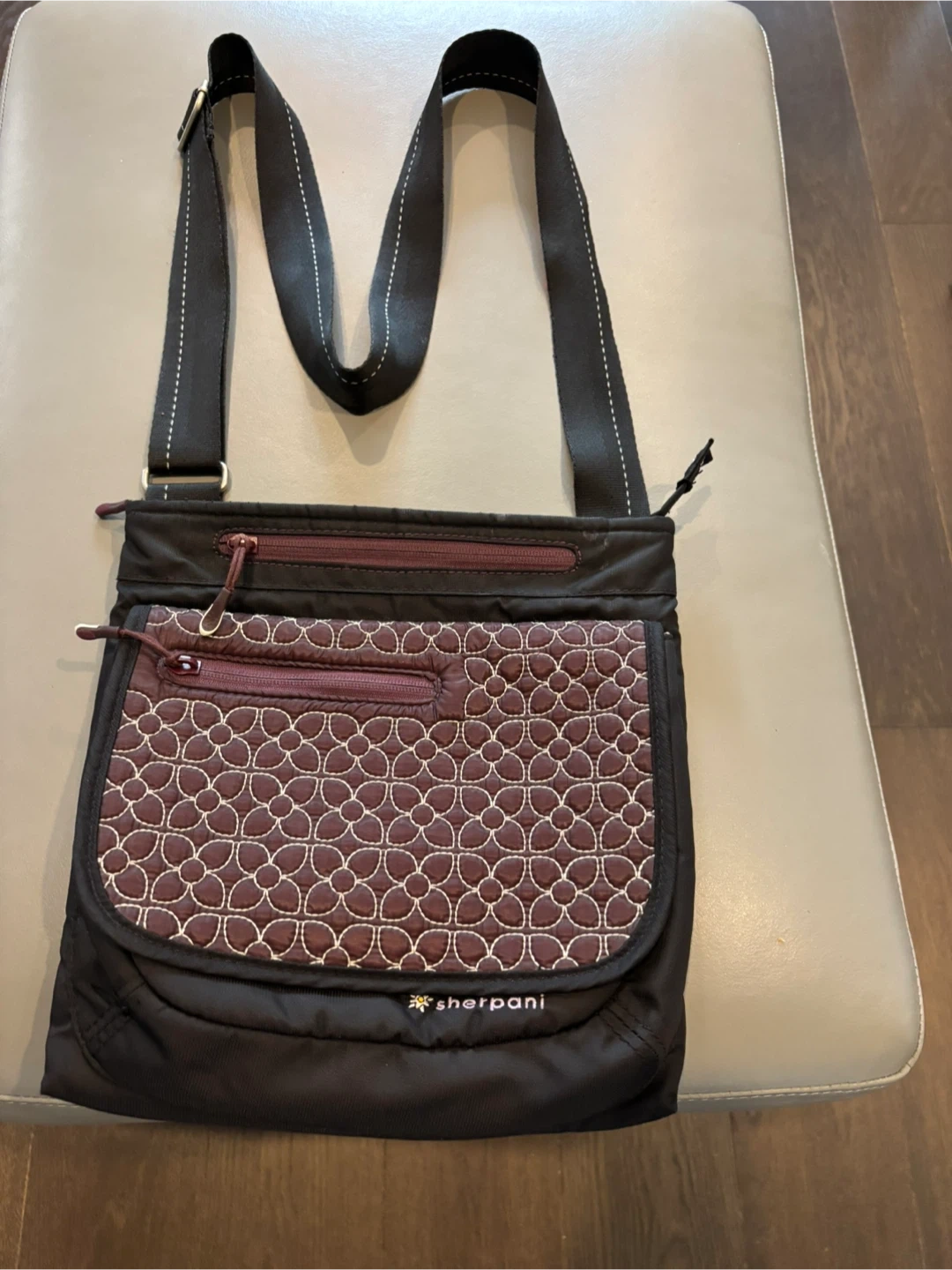 A stylish Sherpani crossbody bag in great condition! The bag features a black body with a burgundy patterned front pocket, perfect for keeping your essentials organized. $20.00 PU Bronte Creek Oakville