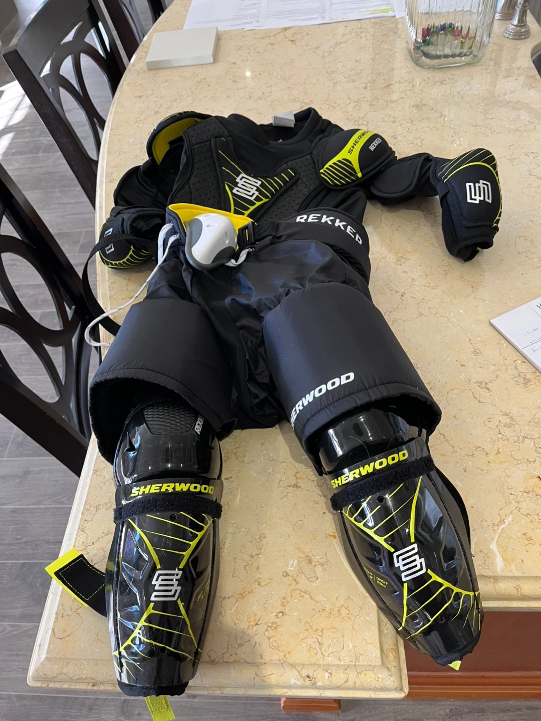 Selling a Sherwood Rekker elite youth hockey kit. This is a complete set designed for up-and-coming young hockey players. The kit includes shoulder pads, elbow pads, shin pads, jock and jill, and pants. The size is medium, suitable for youth aged 5-7.