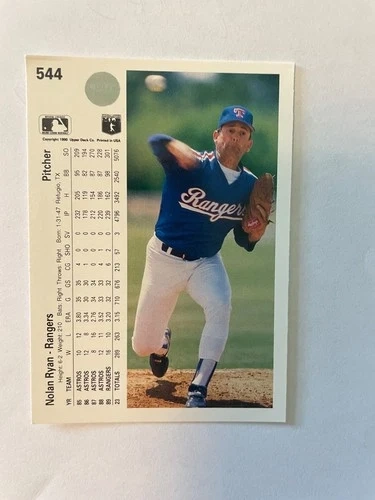 This is a 1990 Upper Deck #544 baseball trading card featuring Hall of Famer Nolan Ryan from the Texas Rangers. It's a sought-after collectible for sports card fans and collectors. This card captures a moment from the 1990 season. Pulled from a pack that was never opened before 7/20/25.
