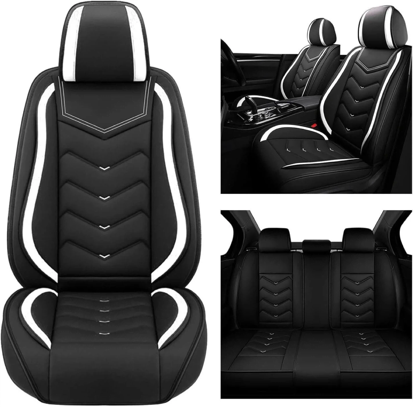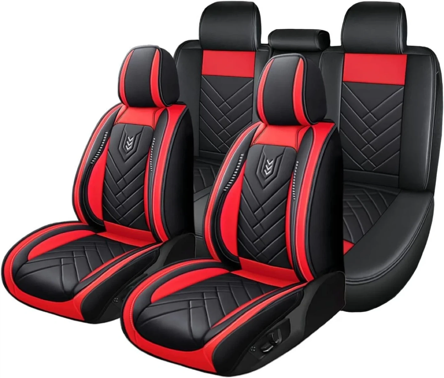 This is a set of car seat covers in black and red. It includes covers for front seats and l a rear bench seat. They're designed to fit most standard vehicles.