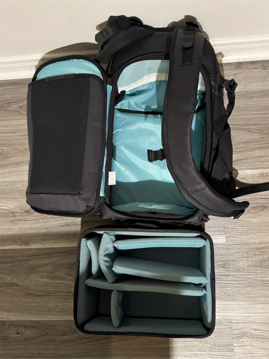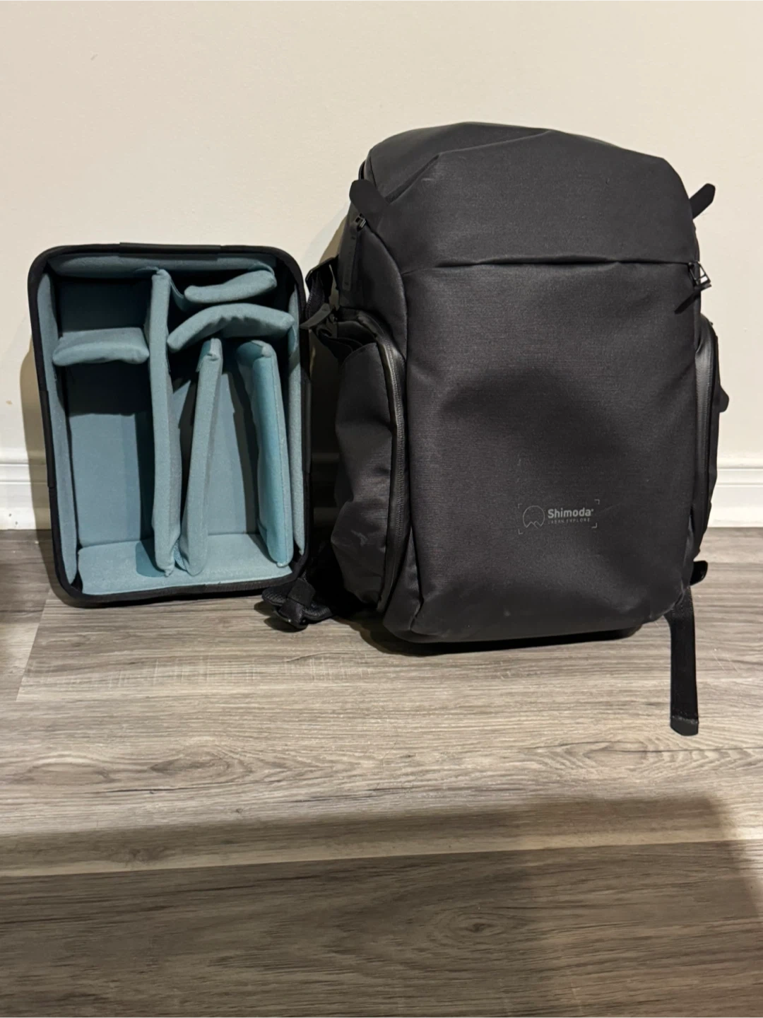 Shimoda photography backpack with removable "core unit" camera cube that fits into the main compartment. Thin sleeve on the shoulder strap to easily and comfortably fit a Peak Design capture clip or similar. Fits laptops up to 14". Back opening for security. Large quick access top pocket. Hidden passport pocket and Air Tag pocket. Luggage pass through. Contrasting inner. Similar to a Wandrd Prvke but better imo. RFS: I just feel like every nice camera bag is too over-built for me, while I'm more minimal with a small camera. Used for a handful of months, still in perfect condition. The camera cube has never been used; I prefer lower weight despite less padding. Please feel free to check out my other posts (current and future). Happy to offer discounts for bundle sales.