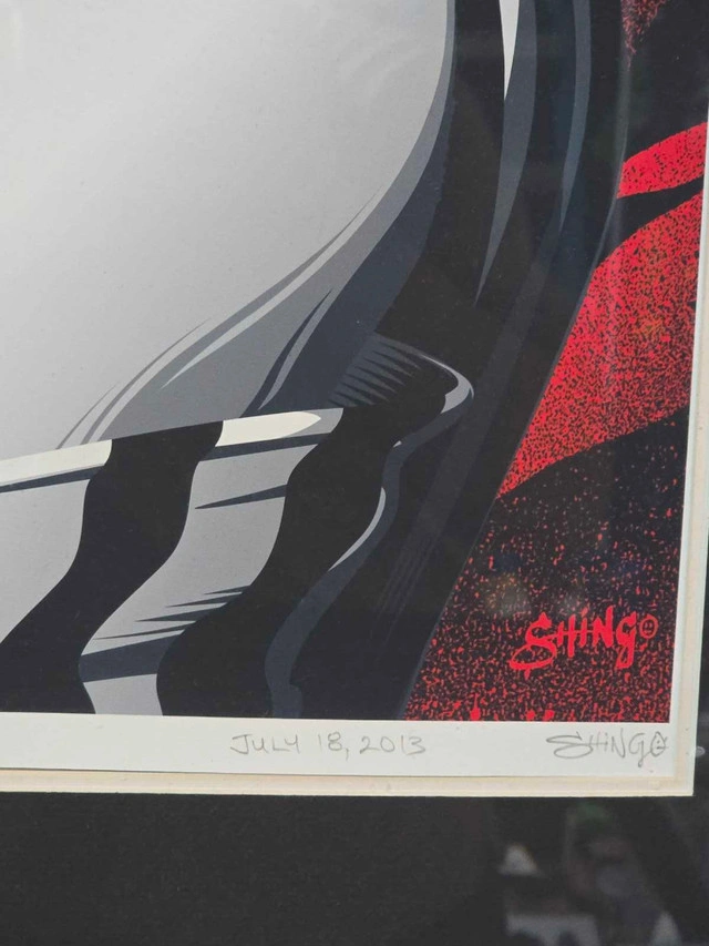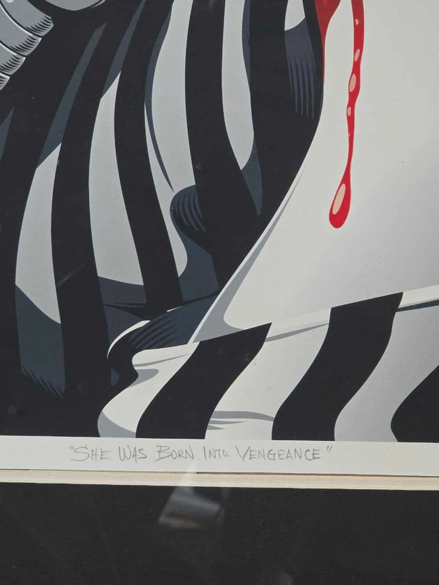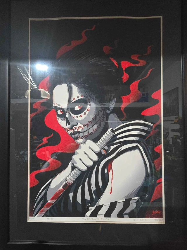 Own a limited edition piece of art! This framed Shingo art print, titled 'She Was Born Into Vengeance,' is number 24 out of only 100 prints. Measuring 18" x 27", this striking piece from July 18, 2013, is ready to add a touch of edgy sophistication to your space. This art print is in like new condition. * Artist: Shingo * Title: She Was Born Into Vengeance * Limited Edition: 24/100 * Dimensions: 18" x 27" * Date: July 18, 2013