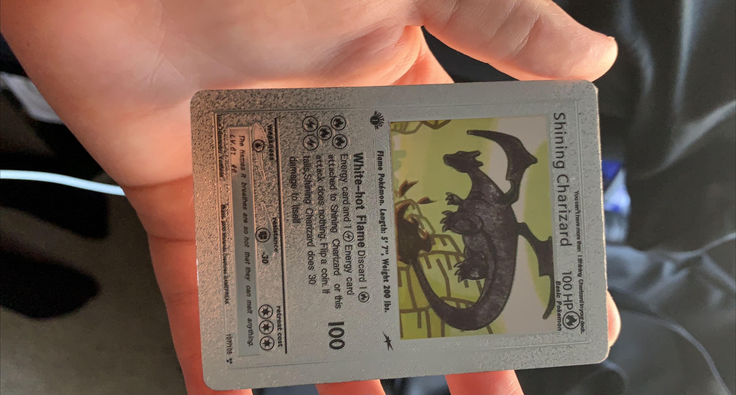 Selling a Shining Charizard Pokemon card. You can't have more than 1 Shining Charizard in your deck. It's a Basic Pokemon with 100 HP. The card features the 'White-hot Flame' attack, discarding one Energy card and one Energy card attached to Shining Charizard. The flames it breathes are so hot that they can melt anything