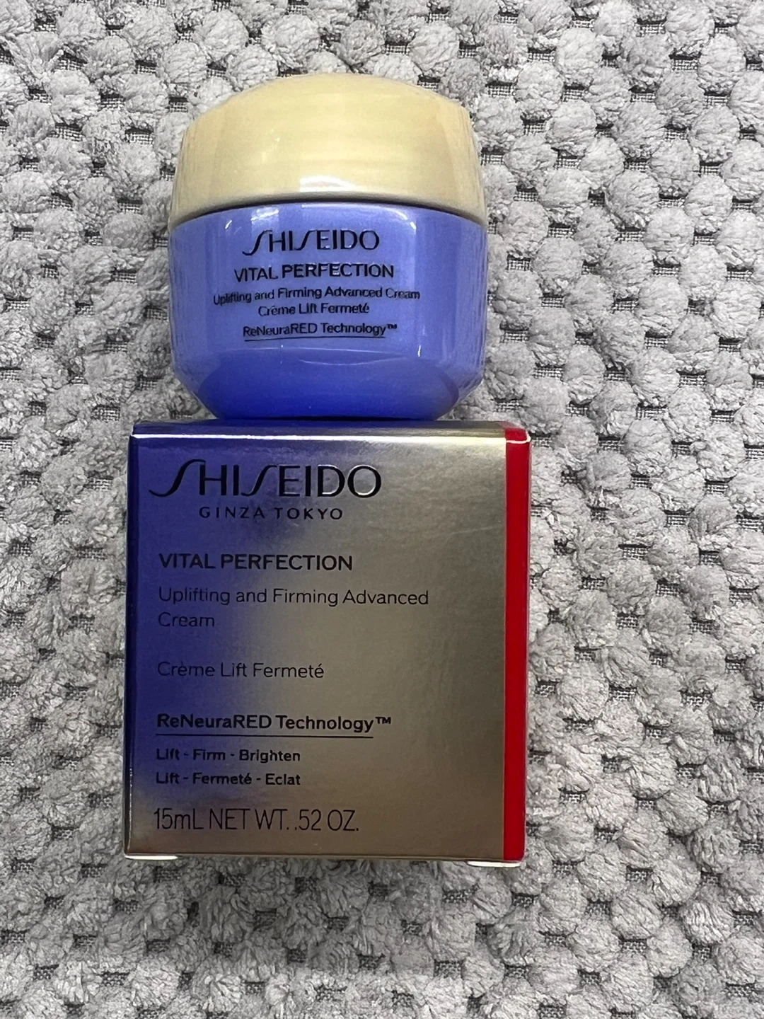 Selling a Shiseido Vital Perfection Uplifting and Firming Advanced Cream. This cream helps to lift, firm, and brighten your skin with ReNeuraRED Technology. It comes in a 15mL size (.52 oz).