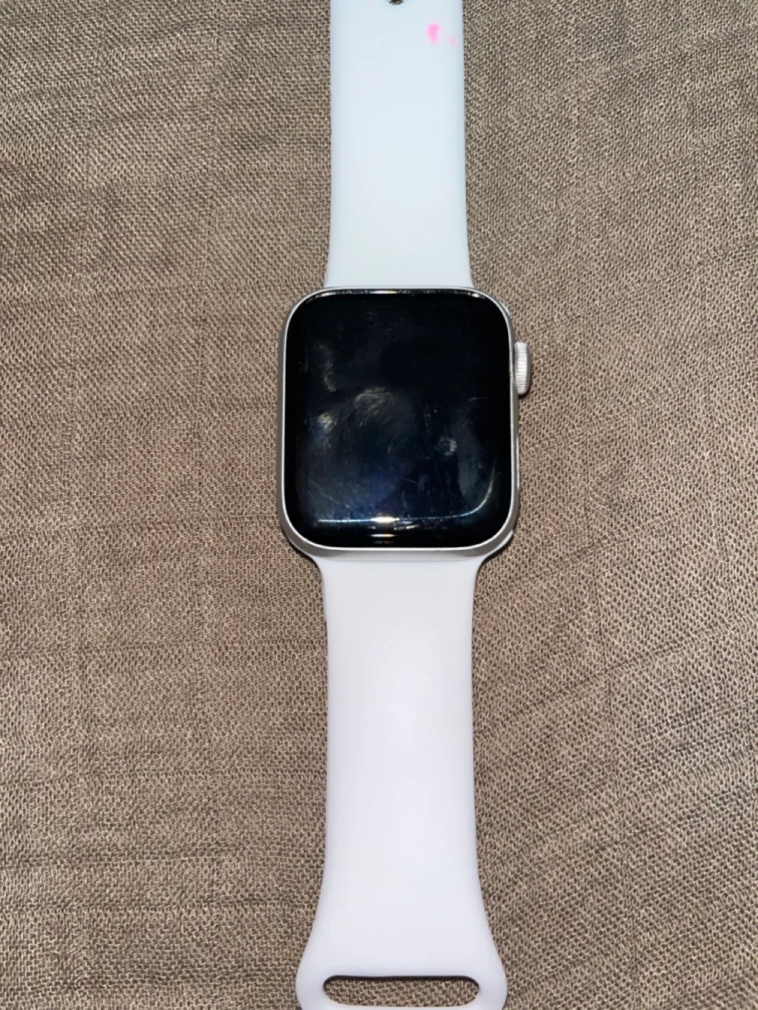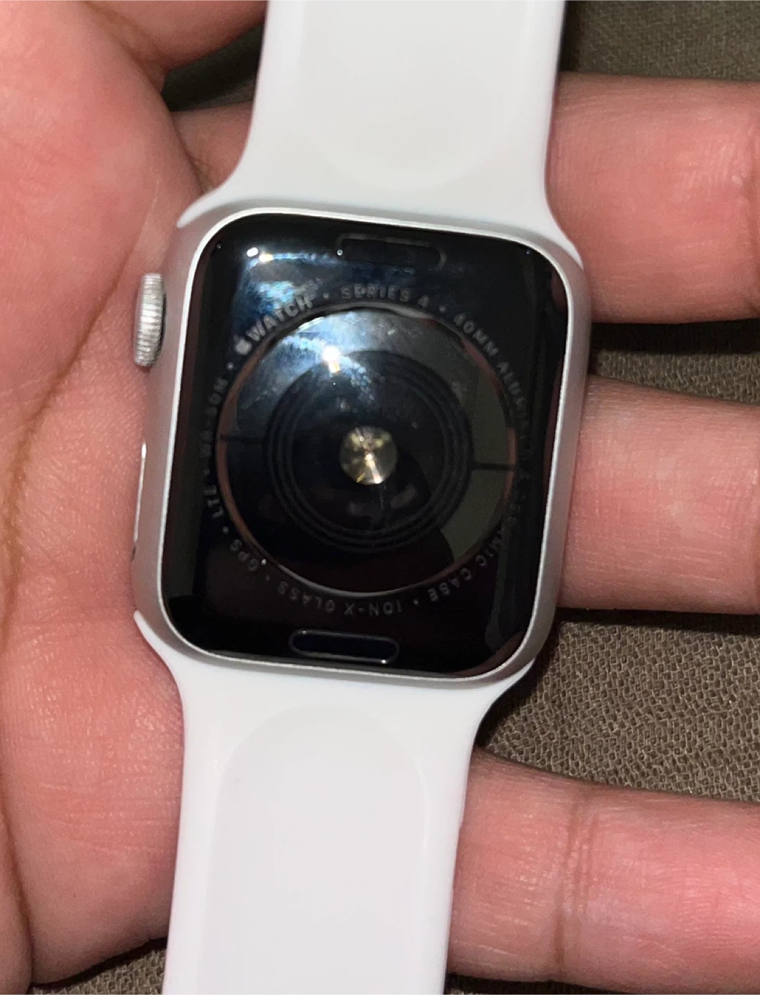 Apple Watch Series 4, 40mm model with GPS. It features an aluminum case and comes with a white band. Selling it for anyone who needs it for parts. It’s in good condition.