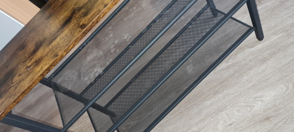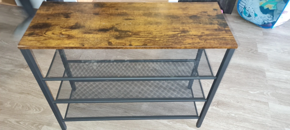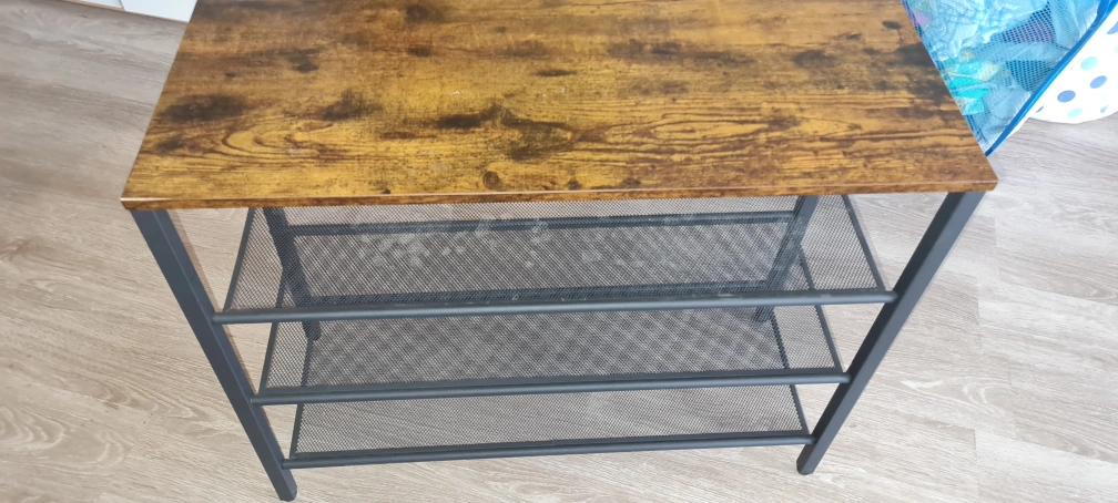 Three-tier shoe rack with a wood top. Metal frame with wire shelves. very sturdy and good quality.