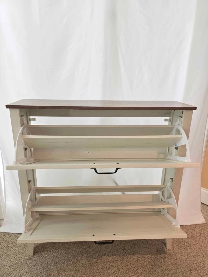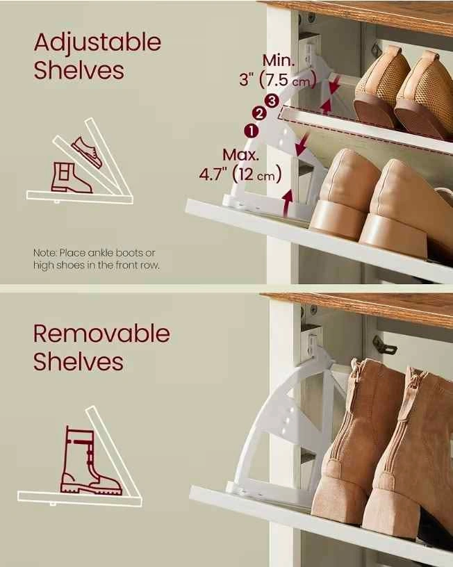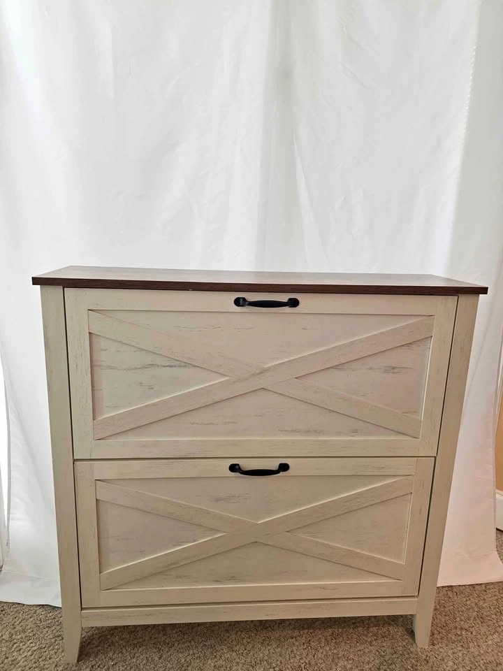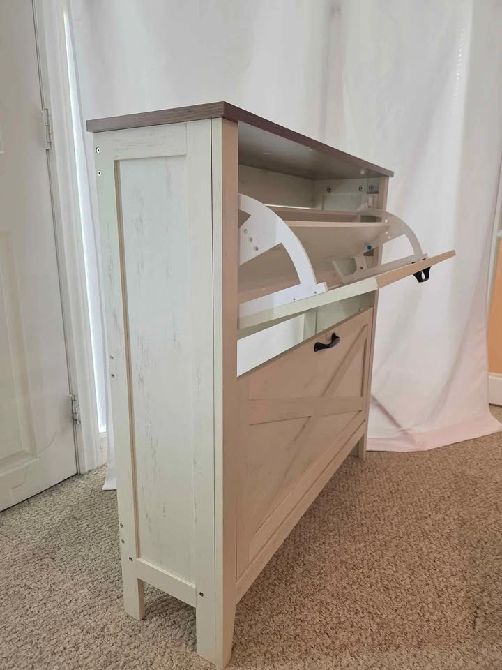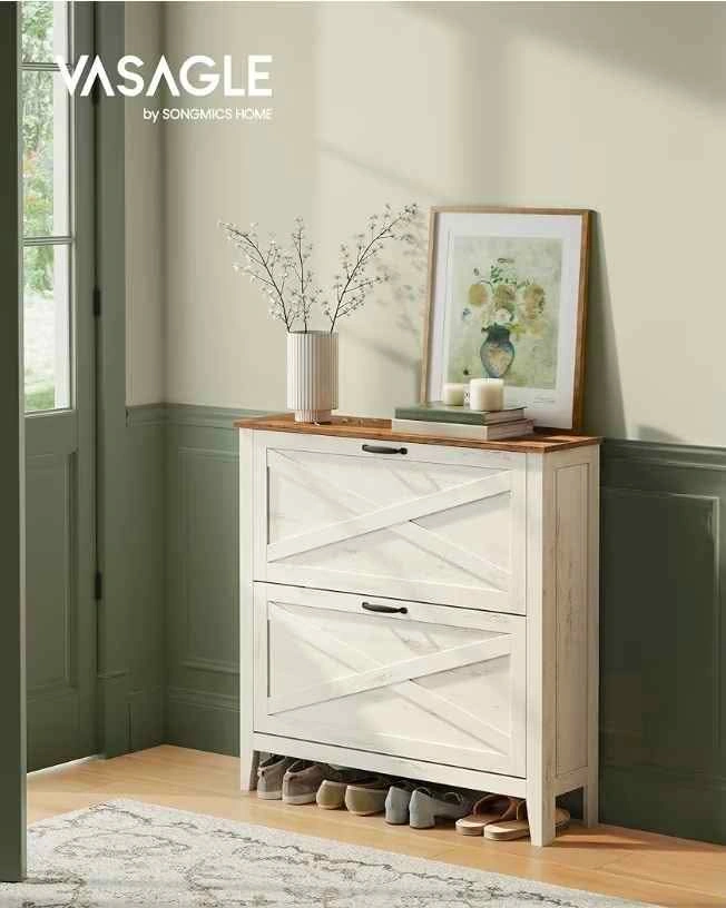 49Rustic 2-drawer shoe cabinet from the VASAGLE LIRY Collection, featuring flip drawers, farmhouse-style design, and a wood-grain top for décor or essentials. Holds 12–16 pairs of shoes with adjustable/removable shelves. Perfect for entryways, hallways, or mudrooms. Brand new, pulled from a liquidation pallet.