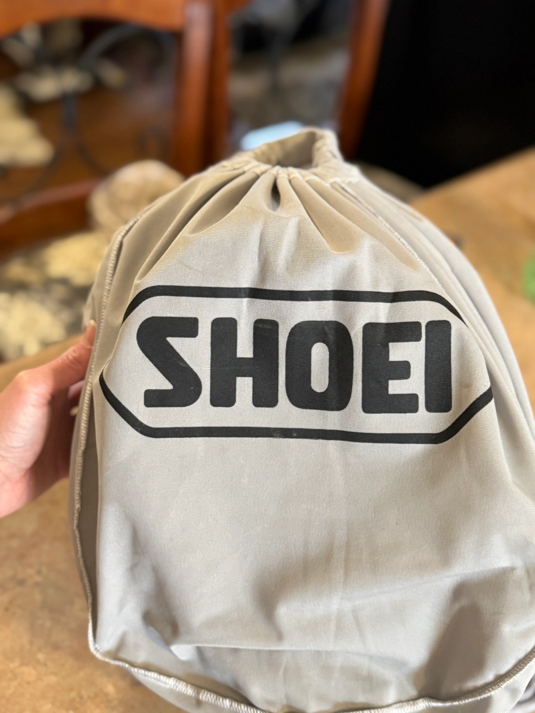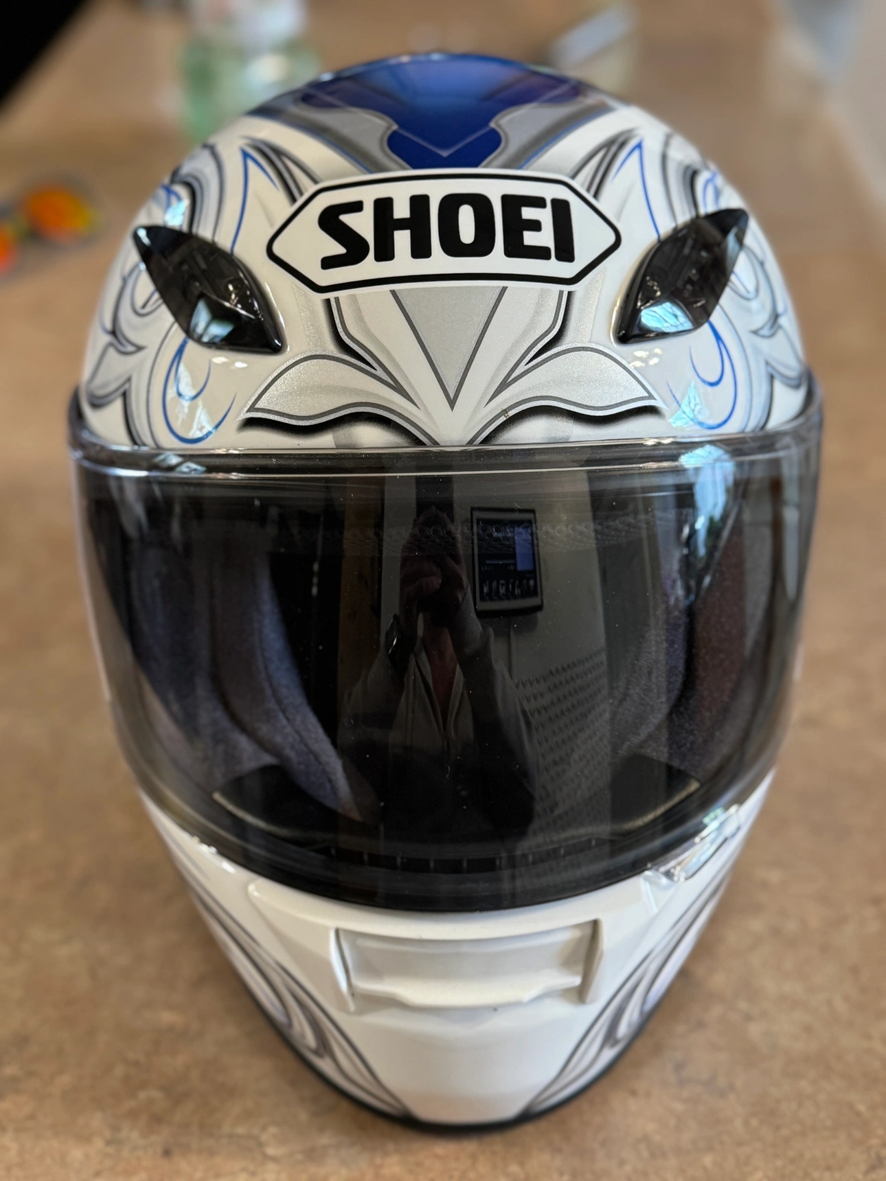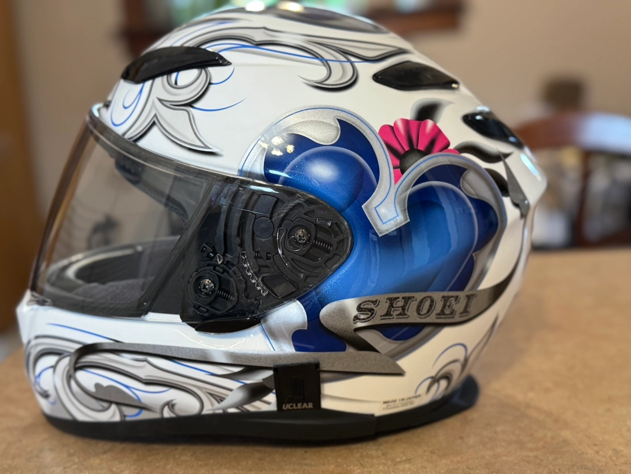 Gorgeous Pre-owned Shoei motorcycle helmet. Features a unique blue and white floral design. Includes helmet bag. Excellent like new condition.