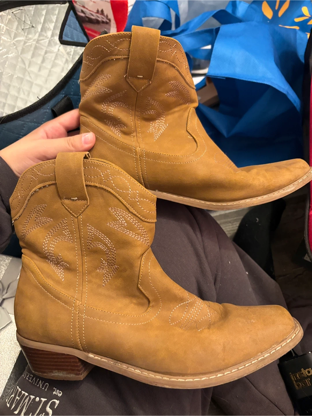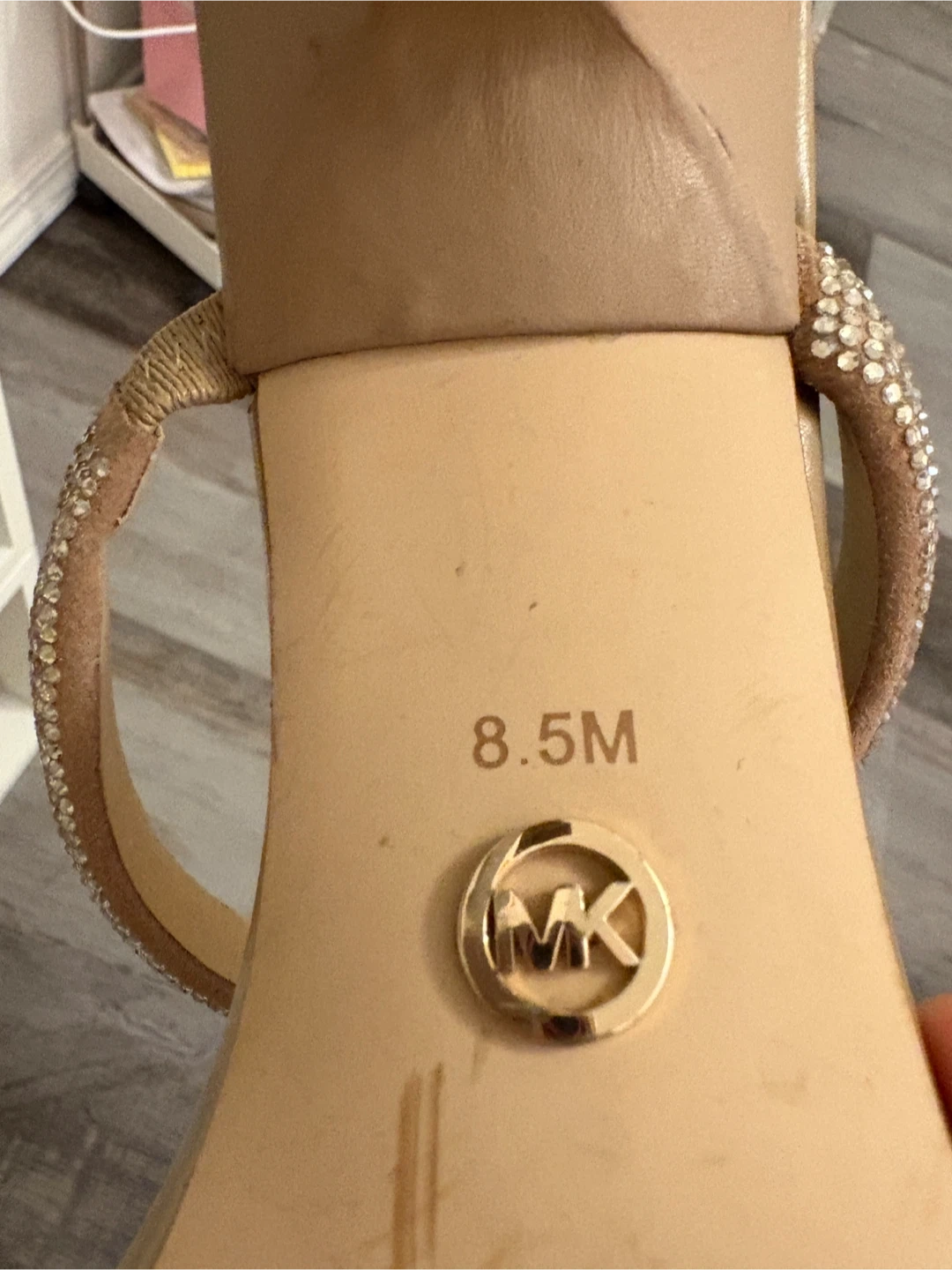 10These are a pair of Michael Kors heels, size 8.5M. They feature a rhinestone design on the straps. They're in good condition, ready for a new home! cowgirl boots $30 white hells $25 mk heels $35 size 8