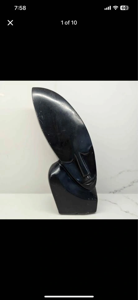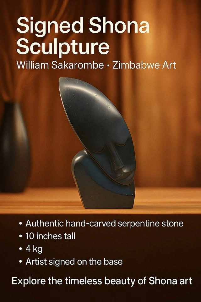 Beautiful hand-carved Shona stone sculpture created by renowned Zimbabwean artist William Sakarombe. Material: Serpentine stone (solid, not resin) Size: 10 inches tall x 6 inches wide Weight: just under 9 lbs (4.02 kg) Style: Abstract face with smooth polished finish, classic Shona art style Signature: Artist-signed on the base (“William Sakarombe”) Shona sculpture is a world-recognized art form from Zimbabwe, celebrated for its graceful abstract forms and use of natural stone. Each piece is unique, hand-carved by master sculptors. This sculpture’s elegant facial design and deep polished black tone make it a striking centerpiece for home décor, art collections, or as a special gift. Condition: Excellent vintage condition. Some natural stone variations and light wear consistent with age. Comparable signed Shona sculptures often sell for $150–$300+ in galleries and online auctions. Asking $100. Pickup in Oakville, ON.