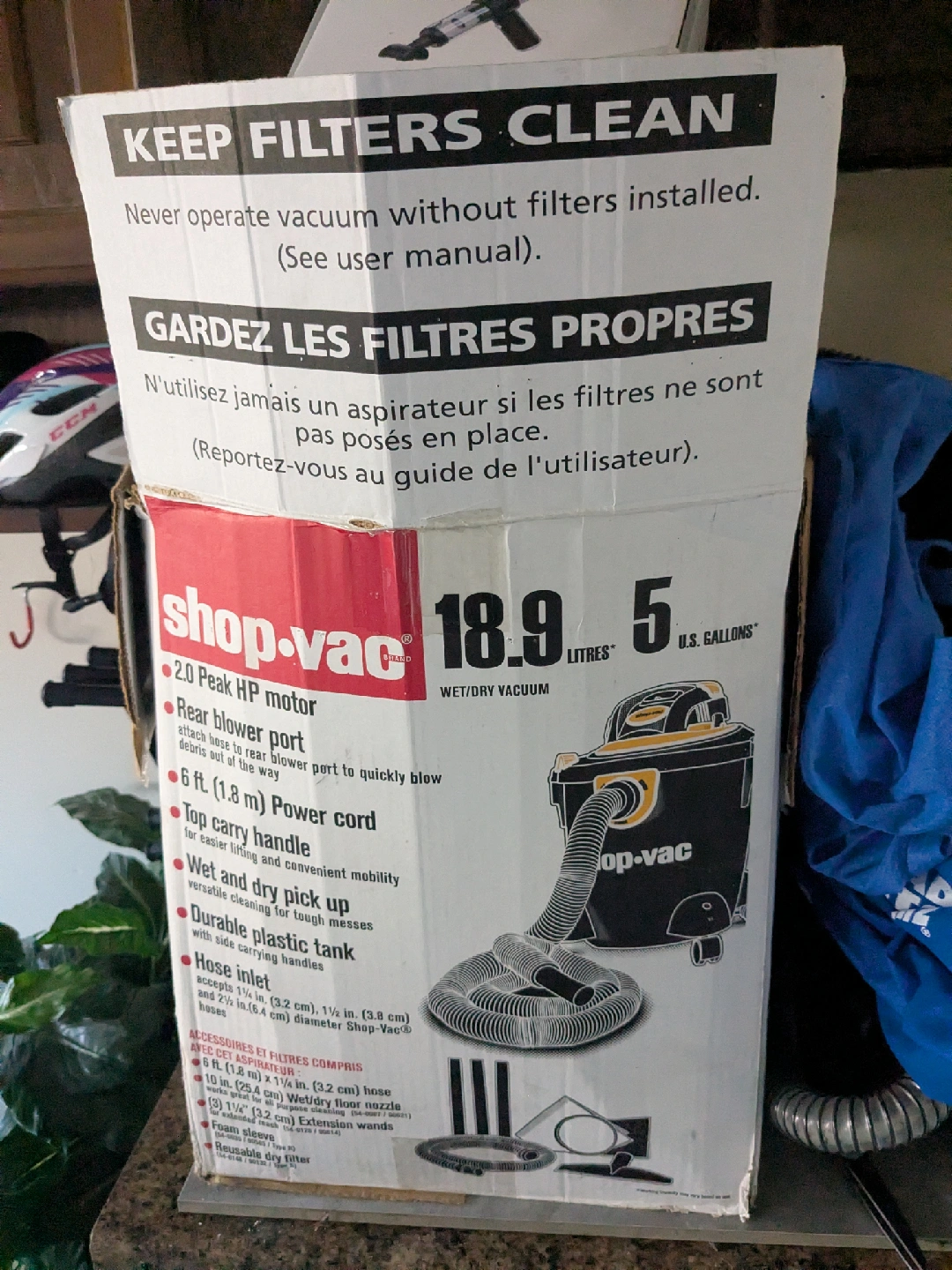10Selling a Shop-Vac wet/dry vacuum with a capacity of 18.9 litres! It has a 2.0 Peak HP motor and a rear blower port to quickly blow debris. Features include a 6 ft (1.8m) power cord and a top carry handle for easy lifting and mobility. Also has a durable plastic tank and a hose inlet that accepts various diameter Shop-Vac hoses. Accessories and filters included are a 6 ft hose, a wet/dry floor nozzle, and extension wands