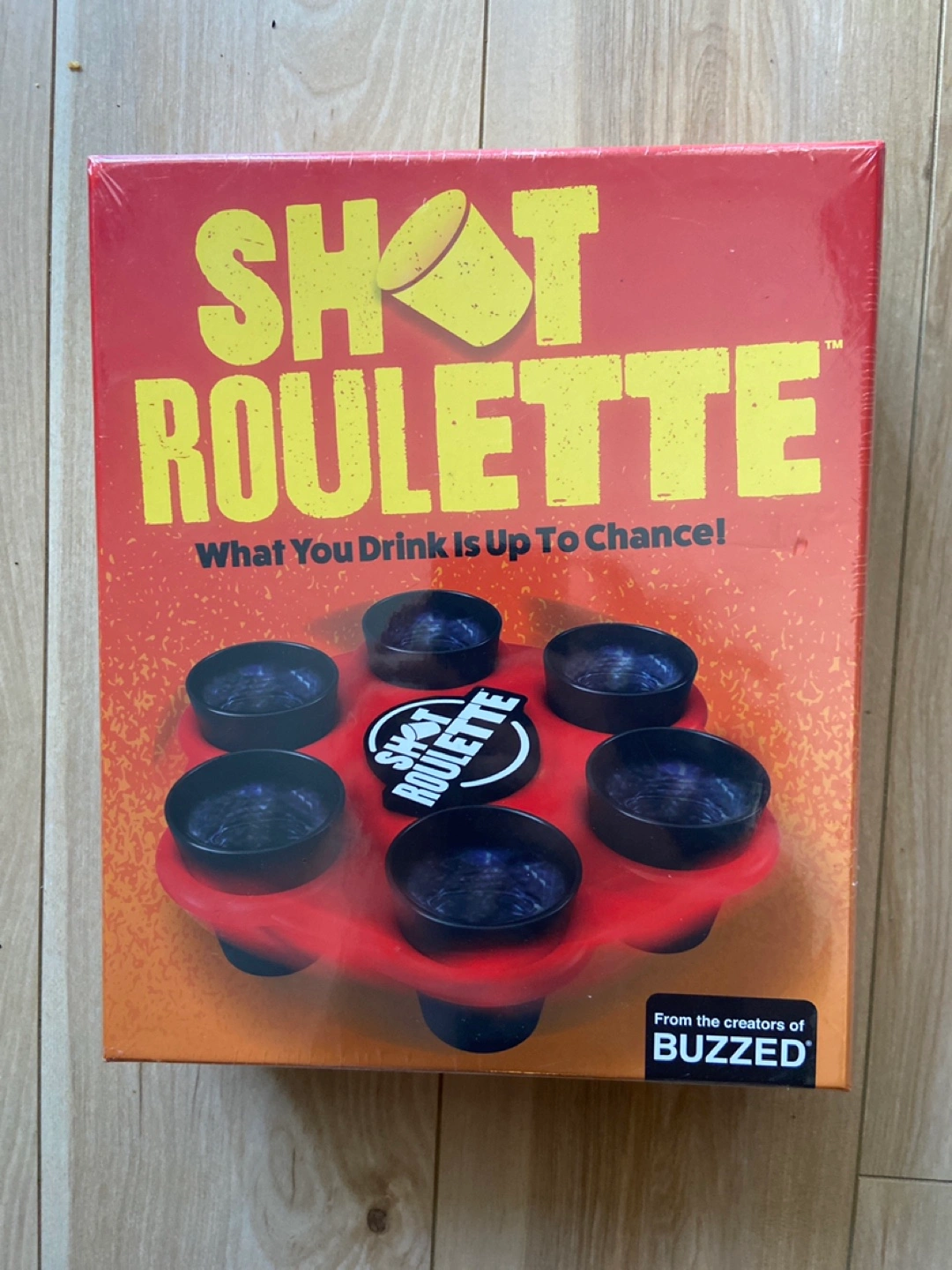 Selling a brand new Shot Roulette drinking game, still sealed in its original packaging! It's from the creators of BUZZED. This fun game includes 1 shot roulette wheel, 6 shot glasses, 12 tokens, and instructions. Perfect for parties and game nights!