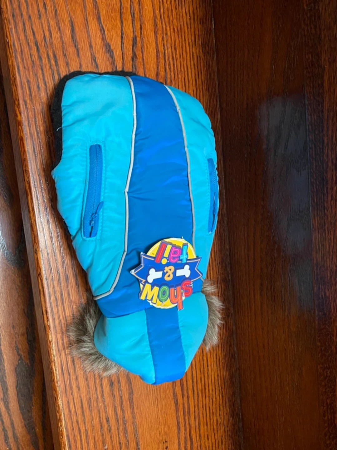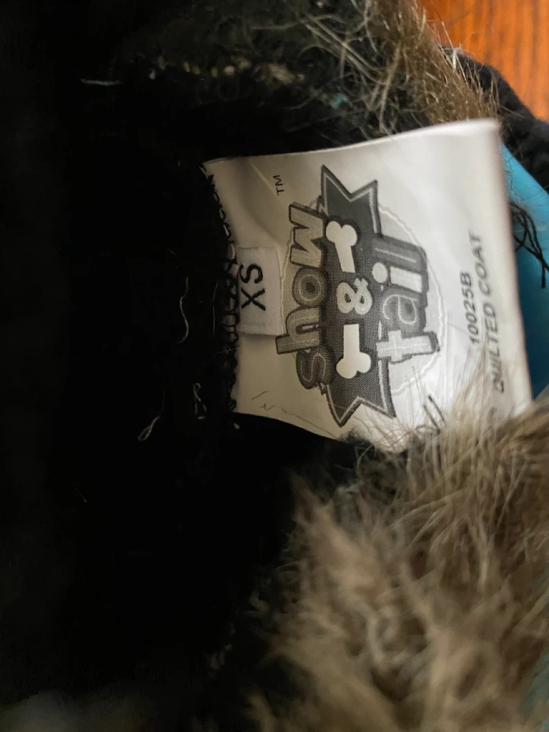 496Keep your furry friend warm with this quilted dog coat from Show & Tail! It's perfect for smaller dogs. The coat is blue and black with a faux fur trim, and the size chart indicates it fits dogs Extra Small Brand New Exact Cash only