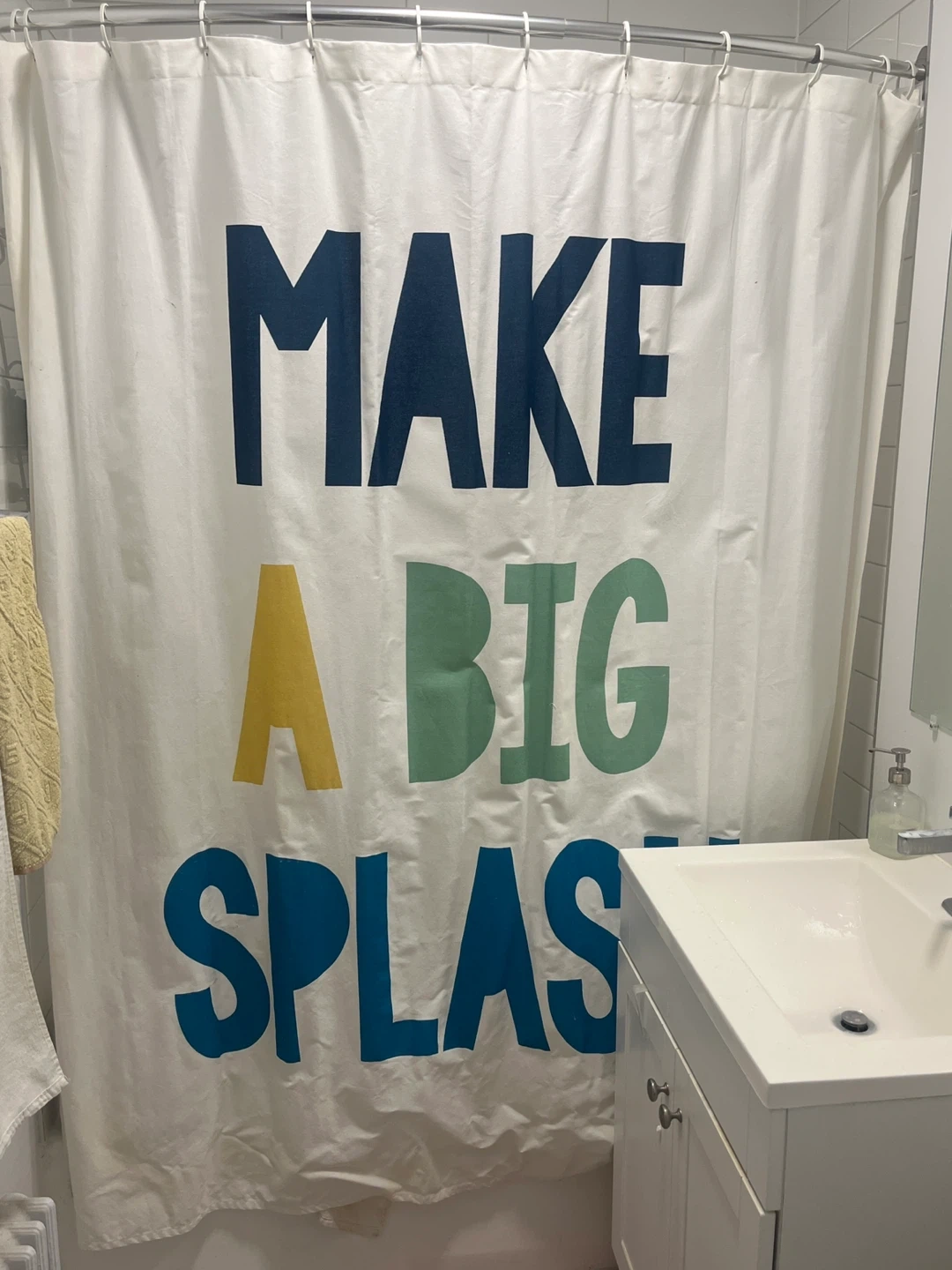 258A fun shower curtain with the words "MAKE A BIG SPLASH" printed on it in blue, green, and yellow