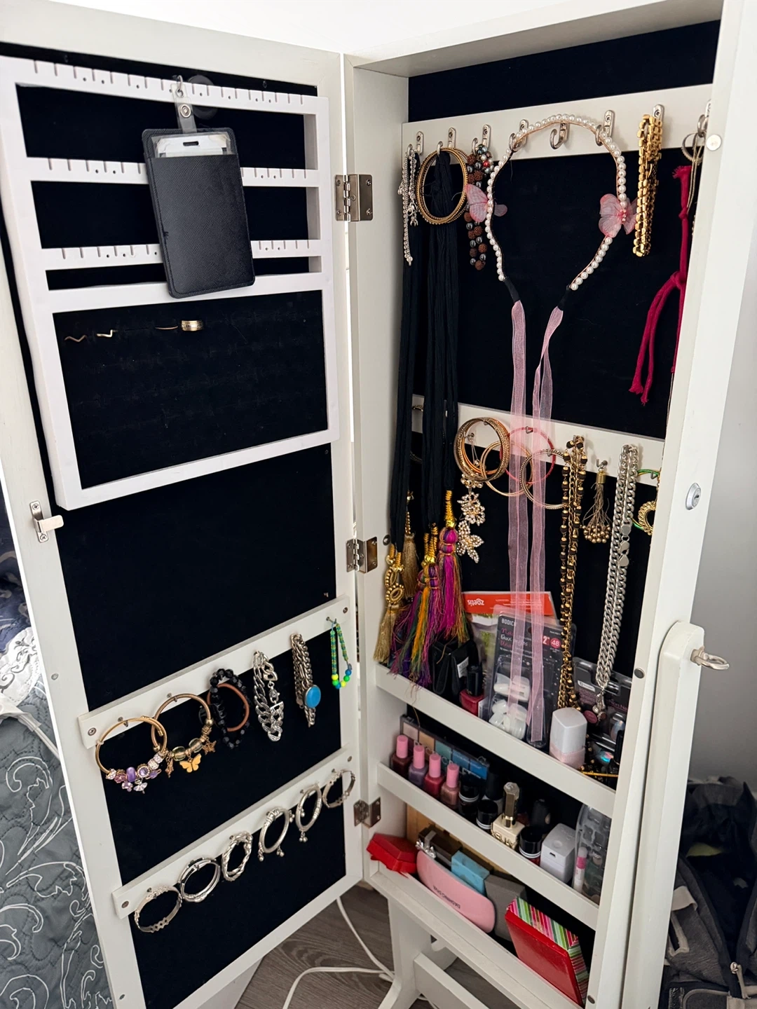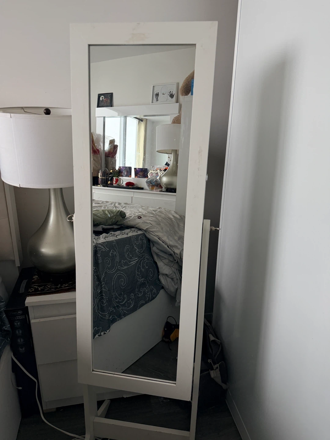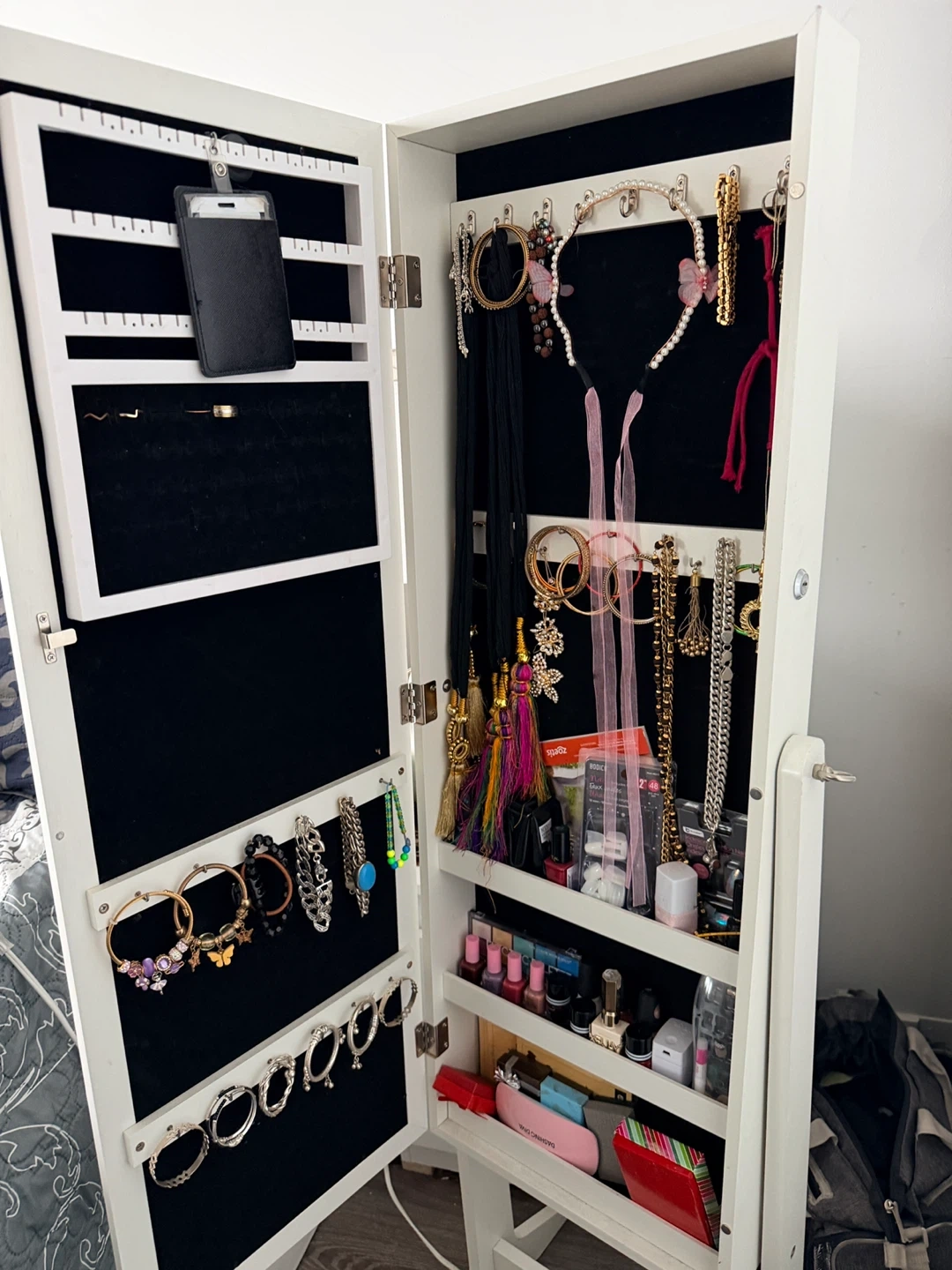 Selling a white jewellery armoire with a full-length mirror. It's perfect for organizing all your accessories and has plenty of space for necklaces, earrings, and makeup. Great for any bedroom or dressing area!