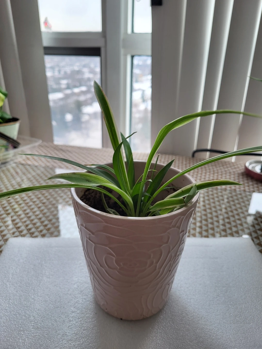 A healthy spider plant with striped leaves, potted in a textured pink ceramic pot. It's a lovely houseplant that's easy to care for. These plants are known for their air-purifying qualities.