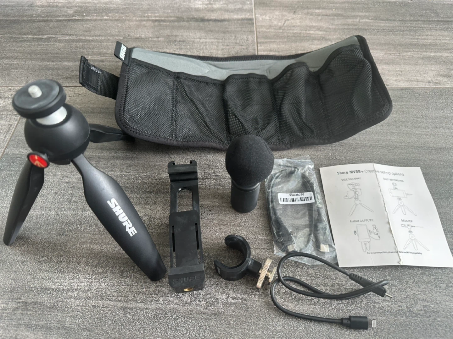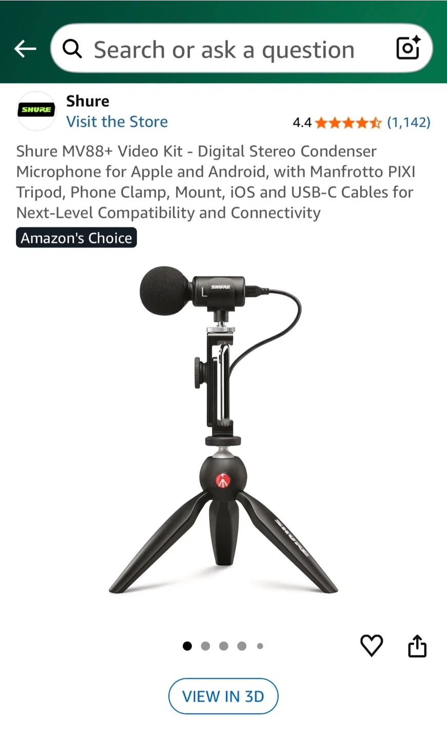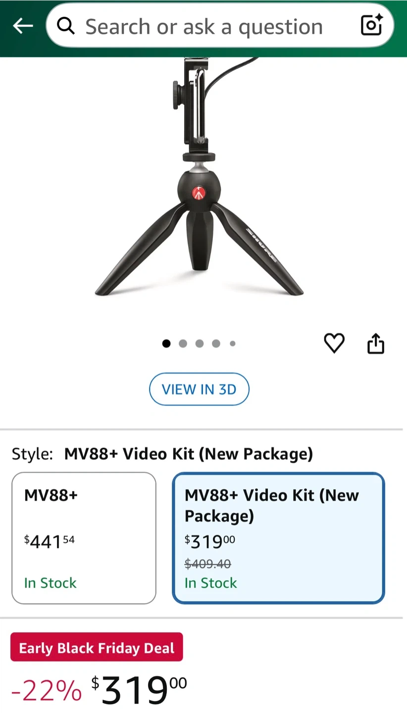 73Shure MV88+ Video Kit, a digital stereo condenser microphone perfect for Apple and Android devices. It comes with a Manfrotto PIXI tripod, phone clamp, mount, and iOS and USB-C cables and a carrying case. Professional sound on the go - just add your phone! Currently selling on Amazon for $319.