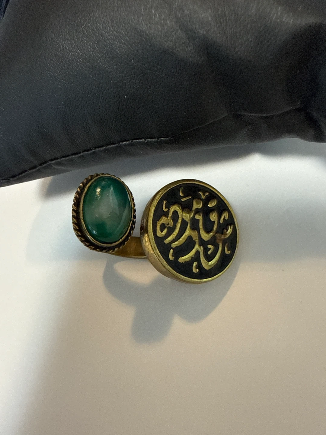 This set includes two unique rings. One ring has a green stone accent, and the other features ornate gold-toned Arabic script on a black background. They're decorative pieces.