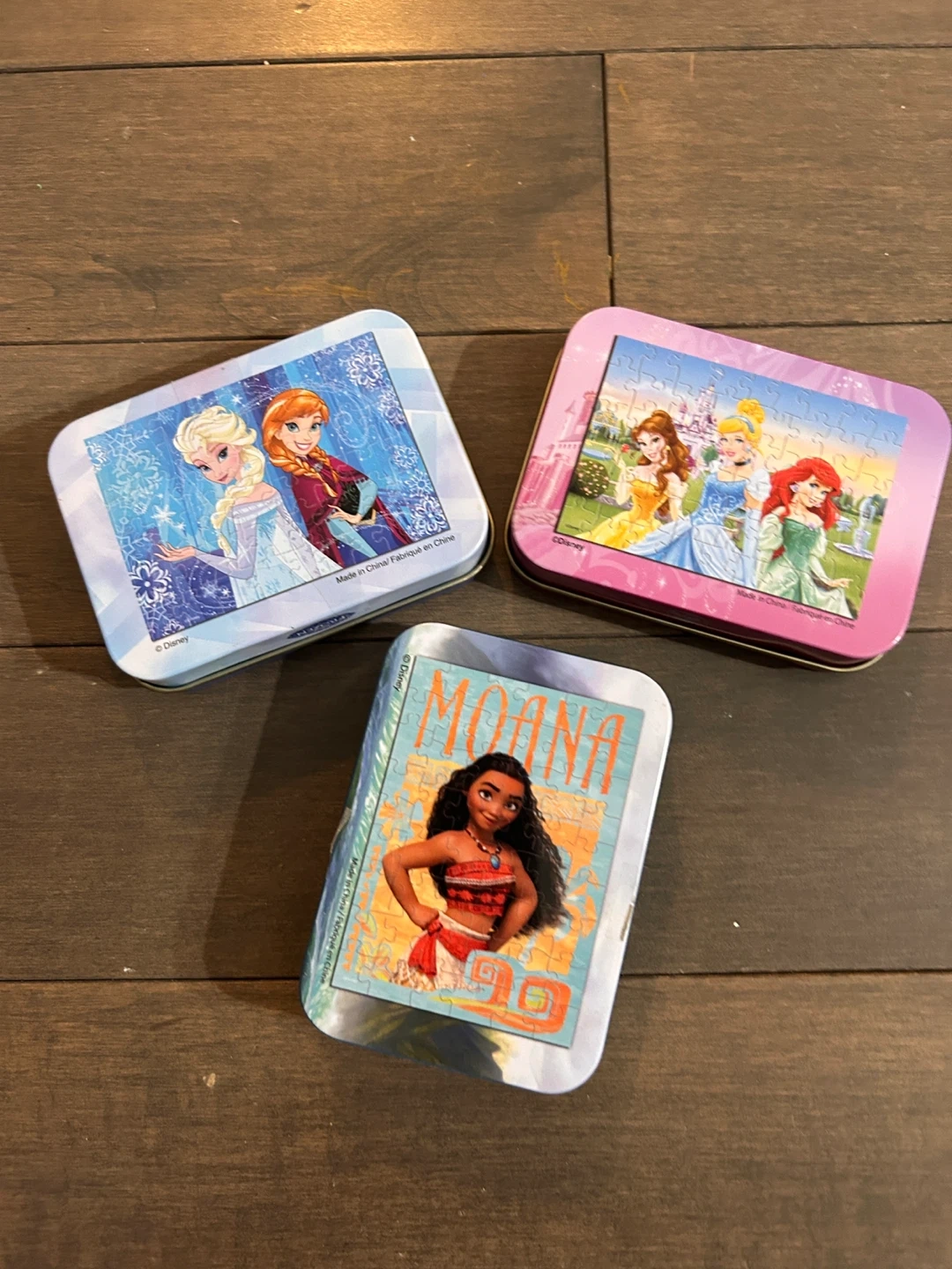 Price is for all. Selling a 3-pack of Disney themed puzzles. Includes Frozen, Moana, and Princesses. Each puzzle measures 5 inches x 7 inches. Great fun for kids!