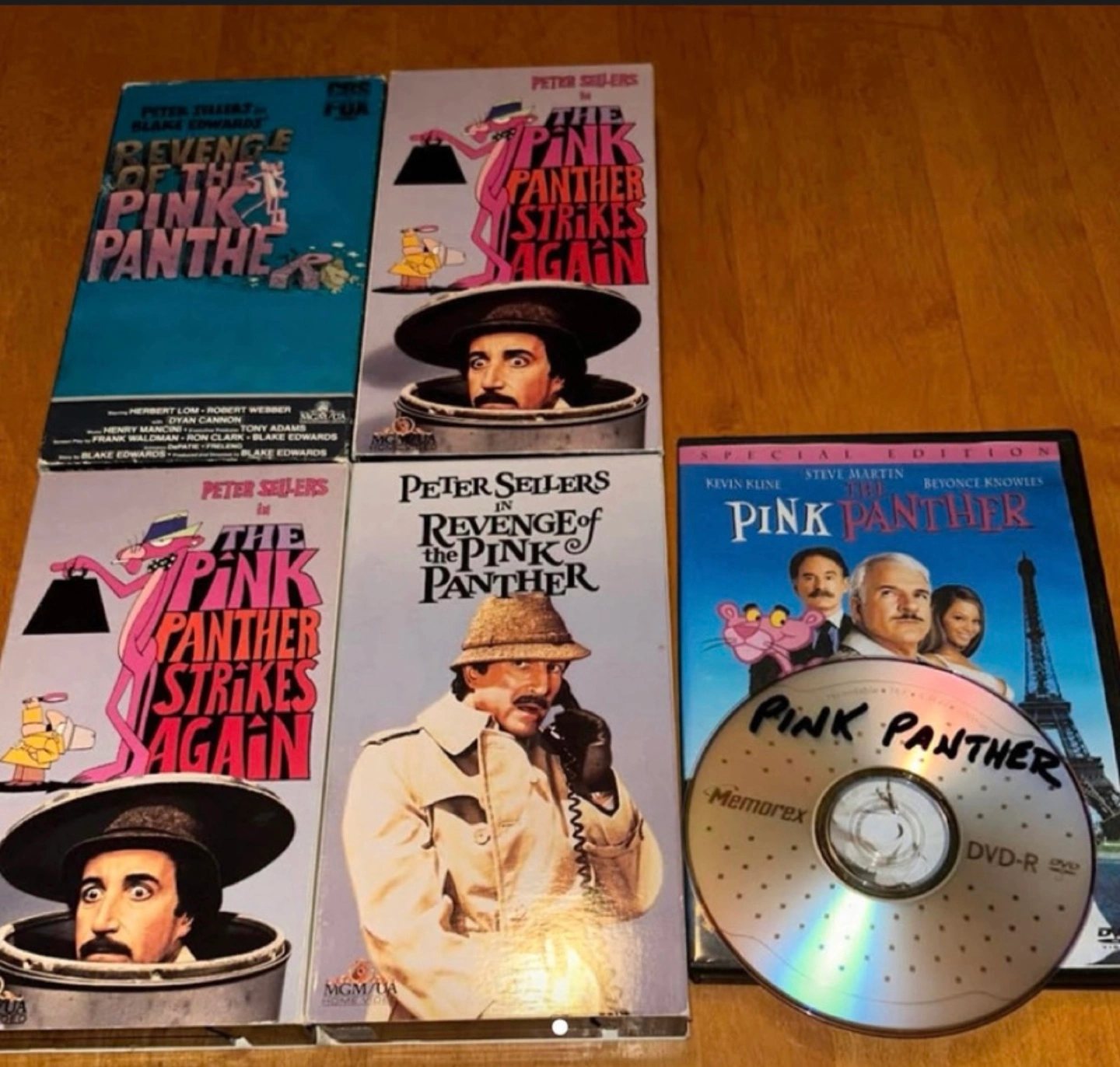 Set of four Pink Panther movies on VHS and DVD. Includes "The Revenge of the Pink Panther", "The Pink Panther Strikes Again", and a DVD of "The Pink Panther" starring Steve Martin.