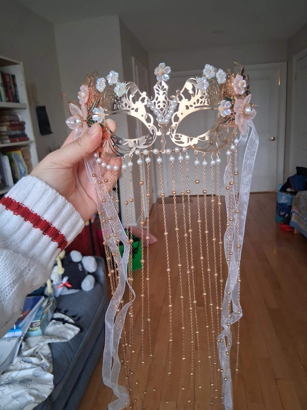 This elegant masquerade mask is crafted from gold-toned metal and adorned with faux pearls and delicate floral accents. It features cascading chains with beads and white ribbon ties for a secure fit. Perfect for costume parties or theatrical events!