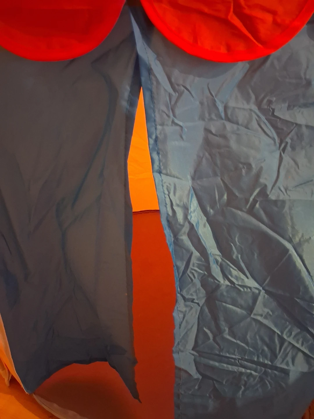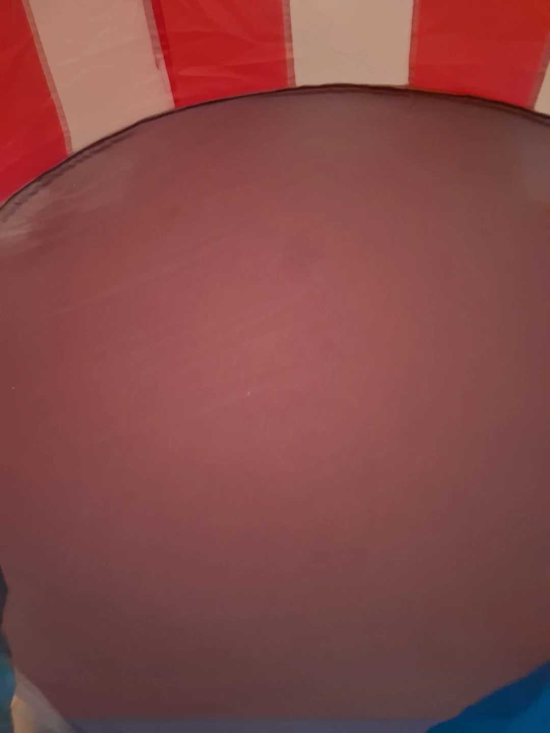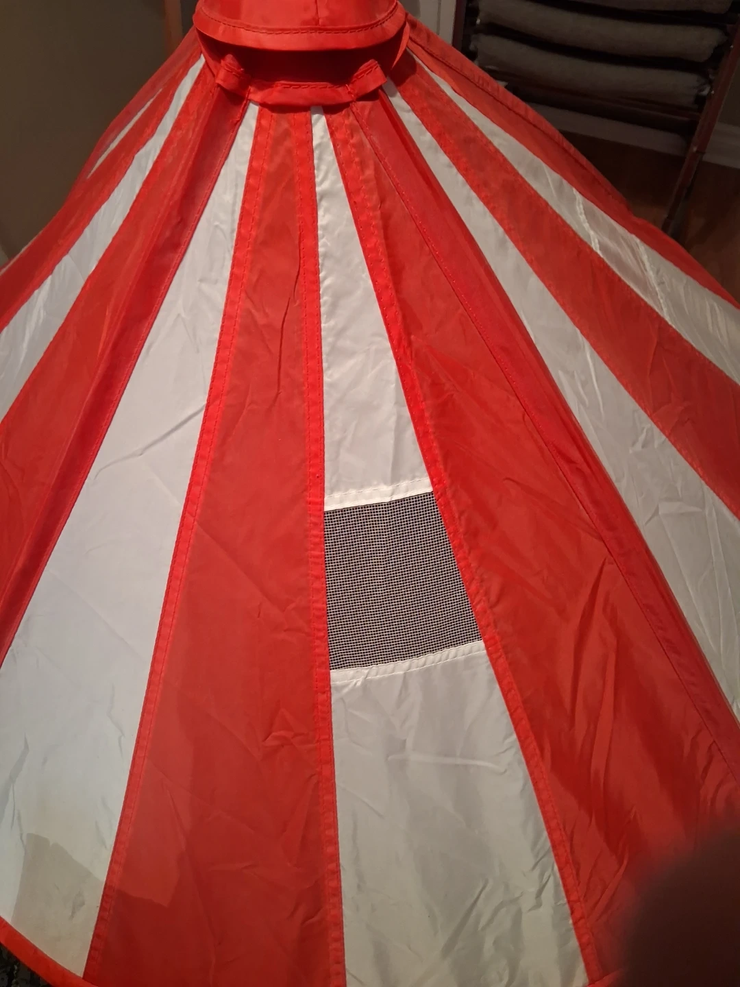 This fun circus-themed play tent made of nylon material is perfect for kids. It features a vibrant red and white striped design with blue curtains at the entrance. It's a great space for imaginative play! It is 3ft across.