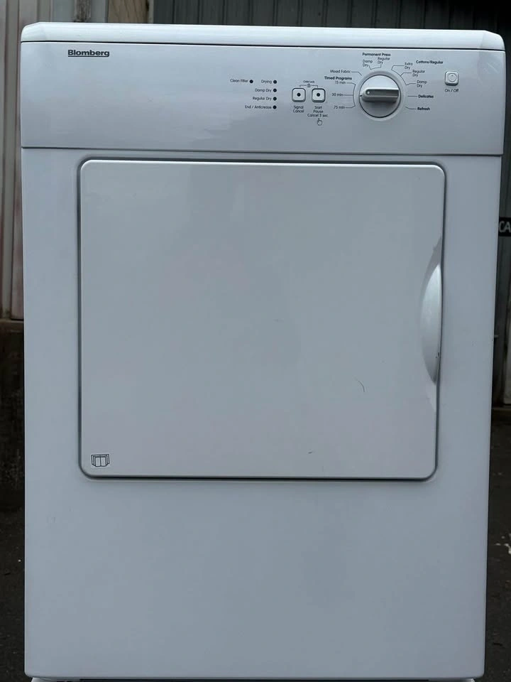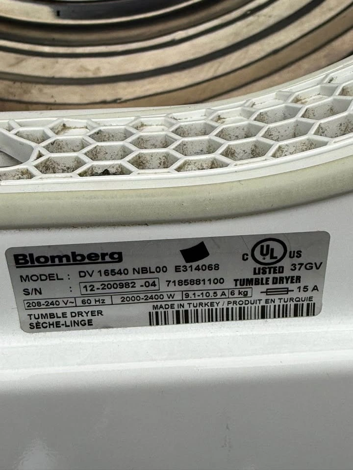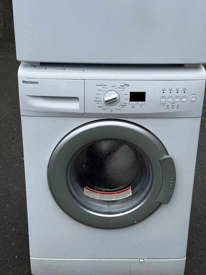 Efficient Blomberg stackable laundry set. This pair has a front load washer (model WM 67120 NBL00) and a tumble dryer (model DV 16540 NBL00). Both units are 208-240 volt. Super convenient for small spaces.