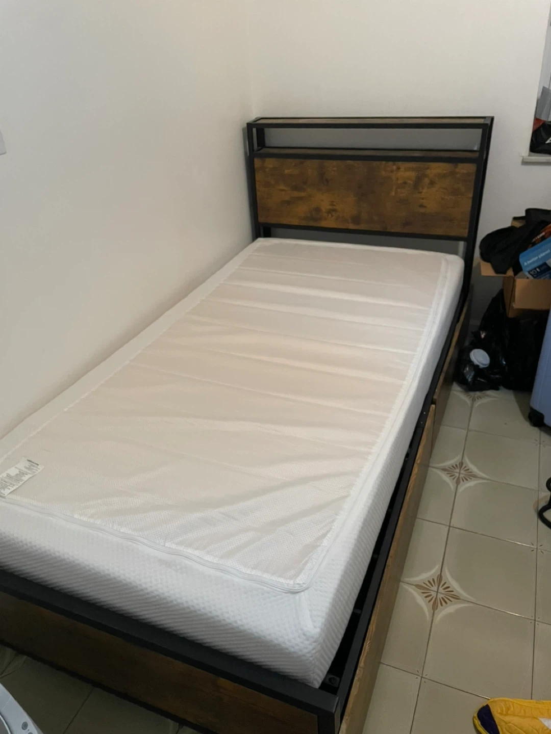 This twin size bed frame features a sturdy metal construction with a rustic wood-look headboard. It includes a mattress and a slat system for support. Storage drawers are built into the base for convenience!