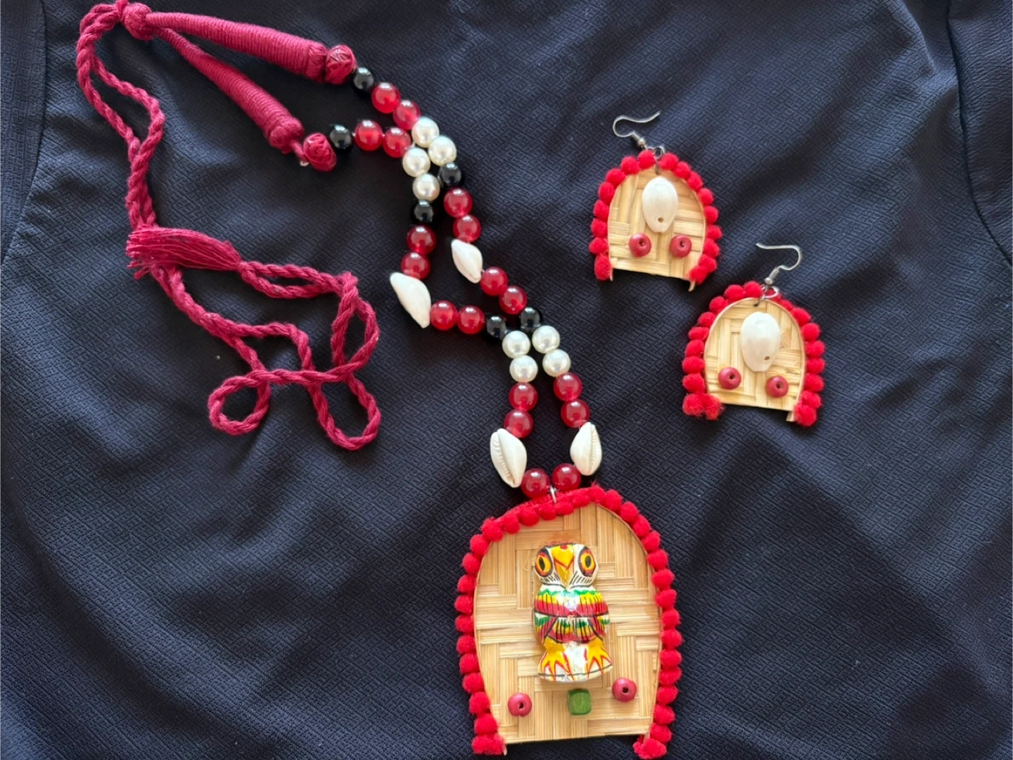 The necklace features a large pendant with a decorative motif and is strung with colourful beads and shells. The earrings complement the necklace design. It's a unique accessory for everyday wear or special occasions!
