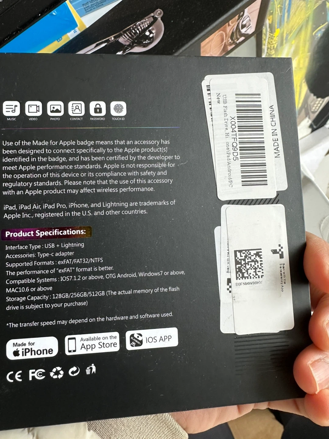 This BLANKBOX+ flash drive is MFi licensed and connects to Apple products. It supports USB + Lightning interface type with Type-C adapter. Available storage is 128GB/256GB/512GB, with exFAT/FAT32/NTFS formats supported. Transfer speed may depend on hardware and software used. It's compatible with iOS 7.1.2 or above, OTG Android, Windows 7 or above, and MAC OS 10.6 or above. Offers free up space on your iPhone, iPad, Android, MAC, and Windows devices!