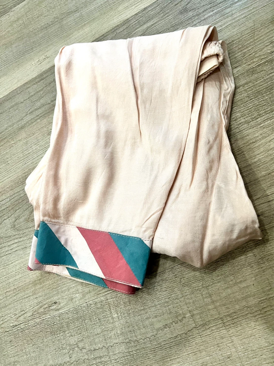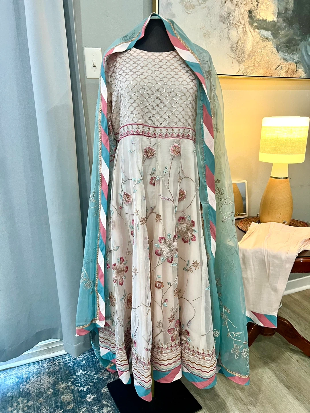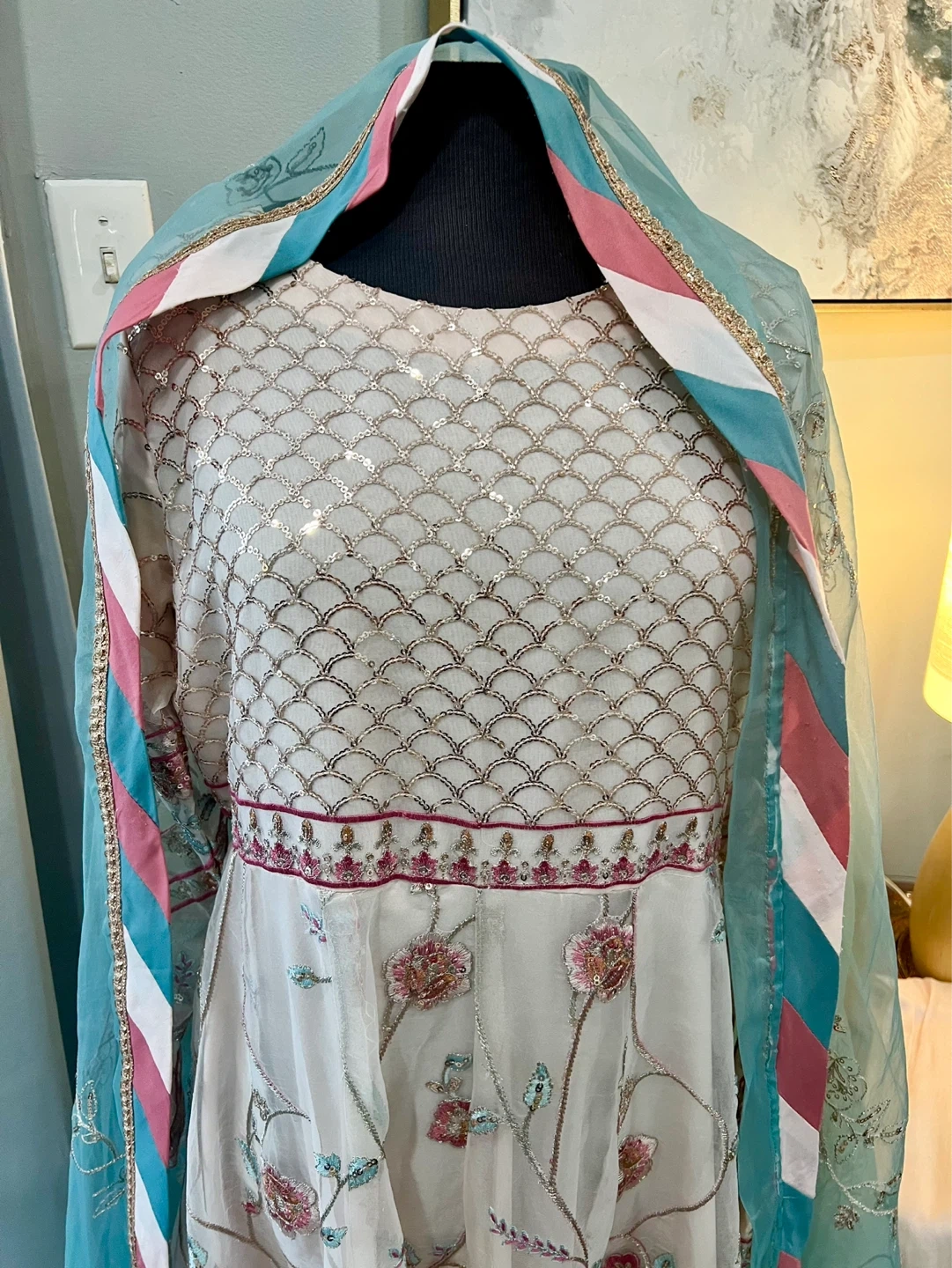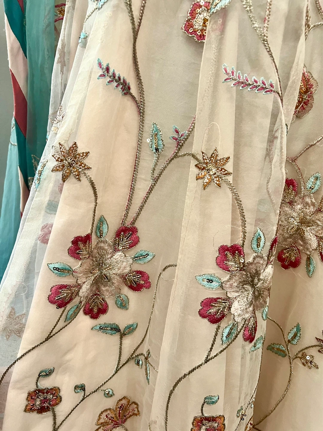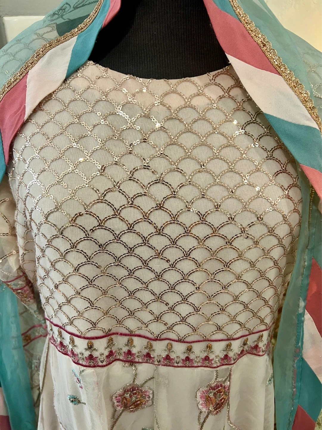 Lightweight dupatta with embroidered floral and leafy patterns. The set includes a cream-coloured dress with sequin detailing on the bodice and matching trousers. Lovely for special occasions!