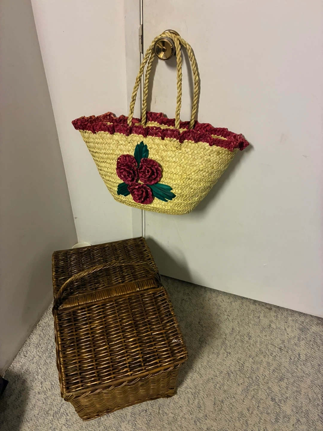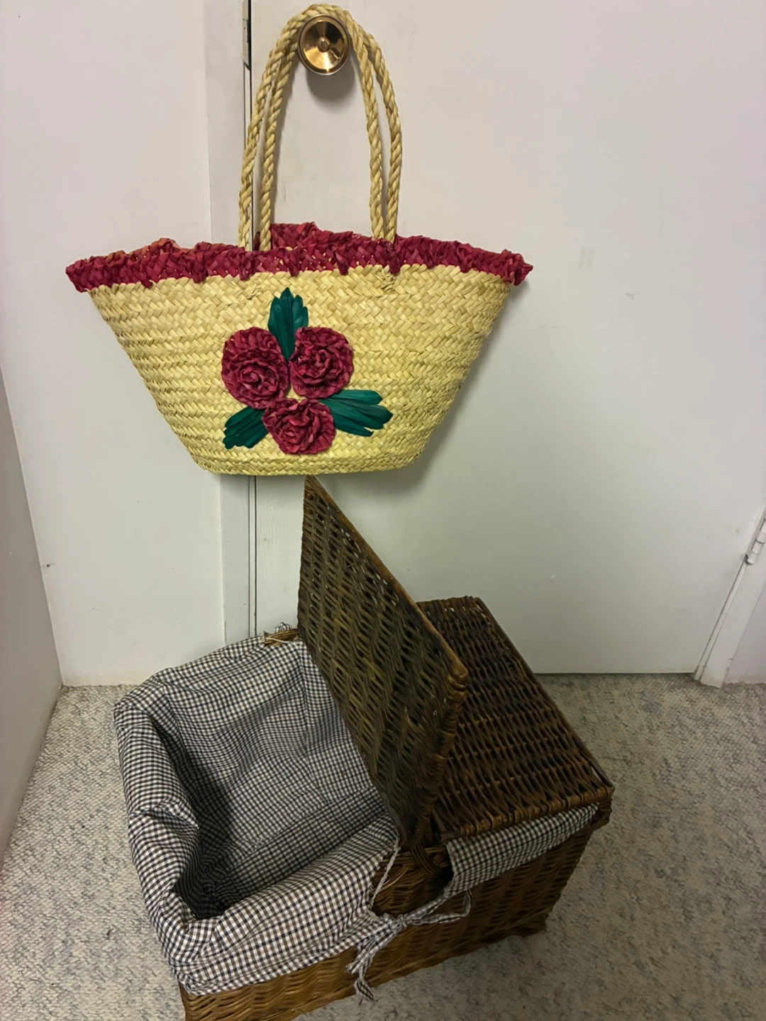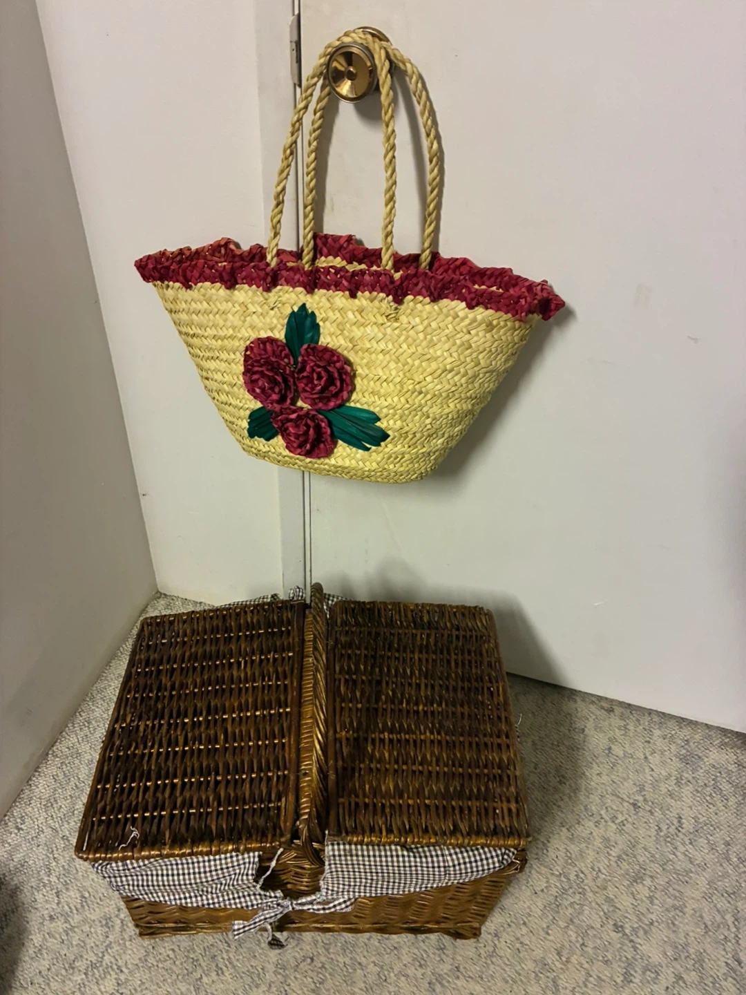 Wicker Picnic Basket and Straw Tote Bag