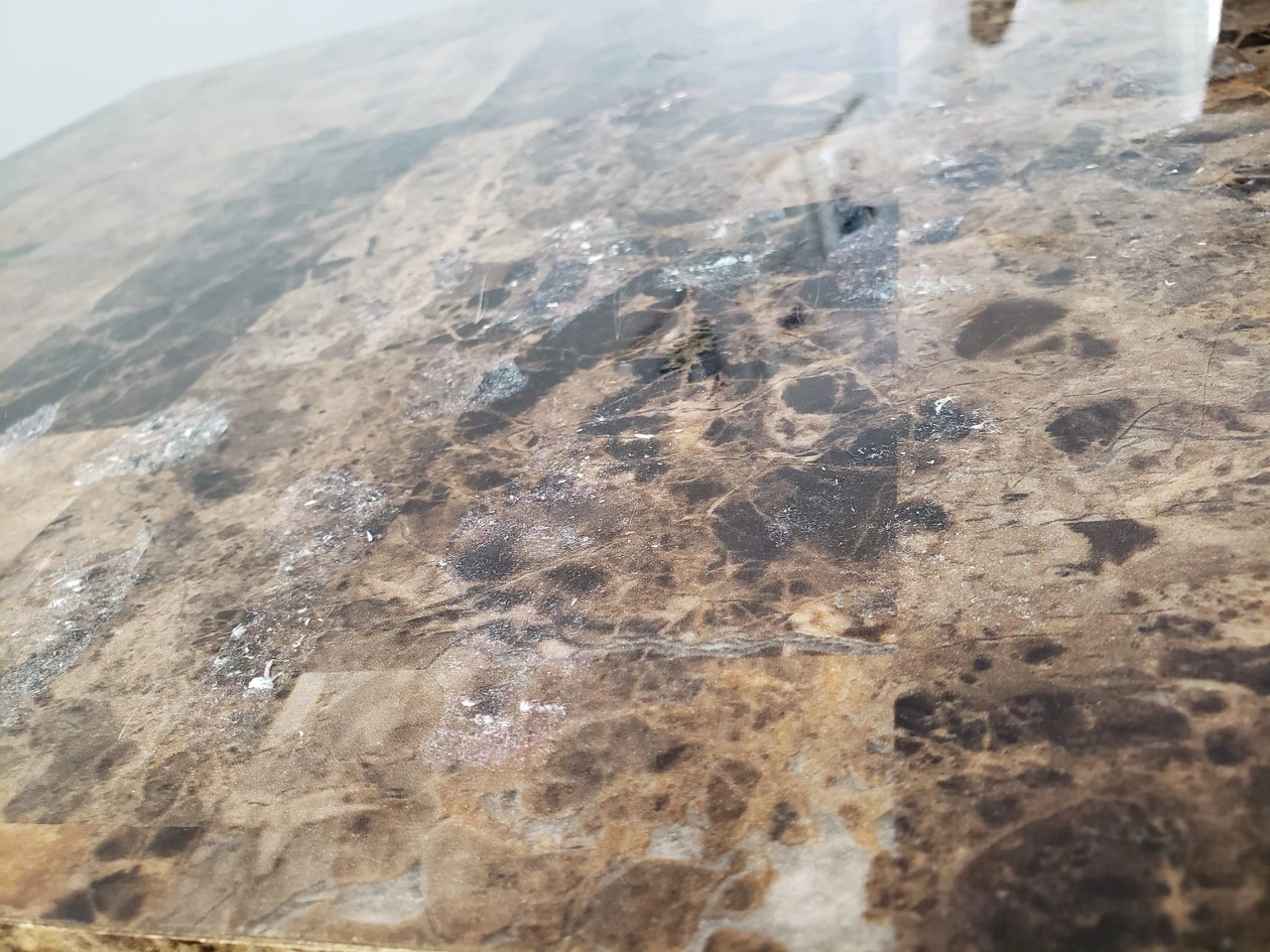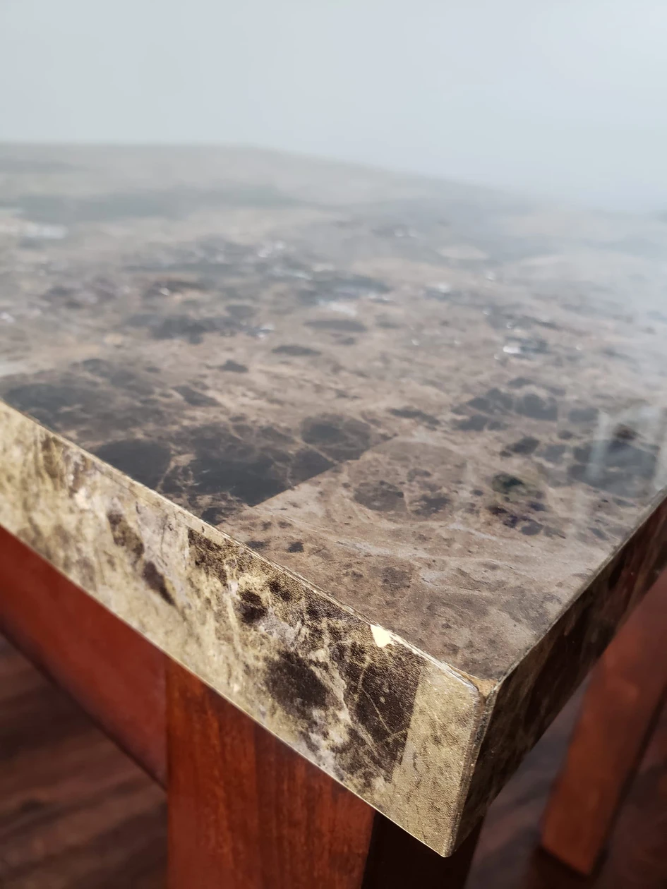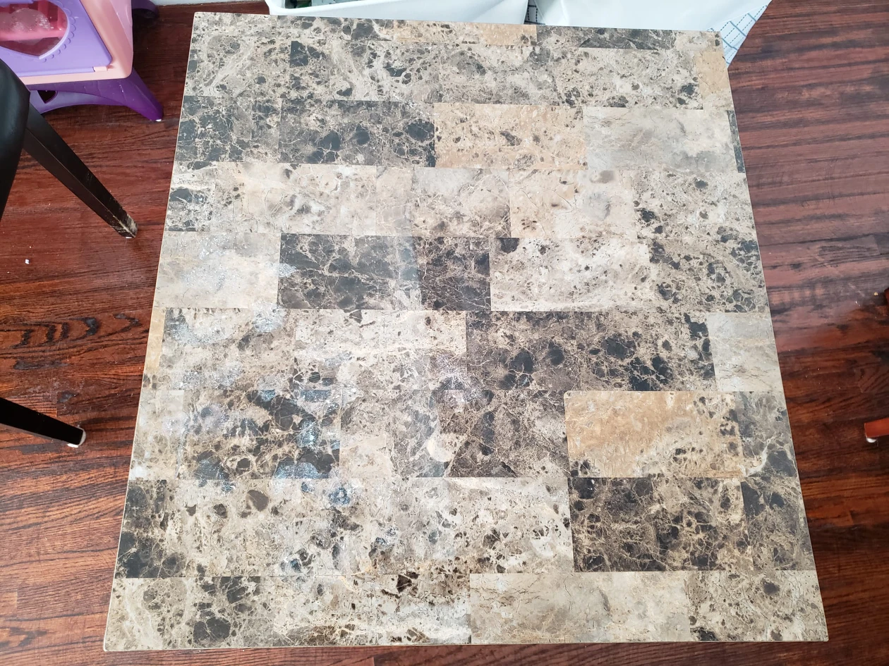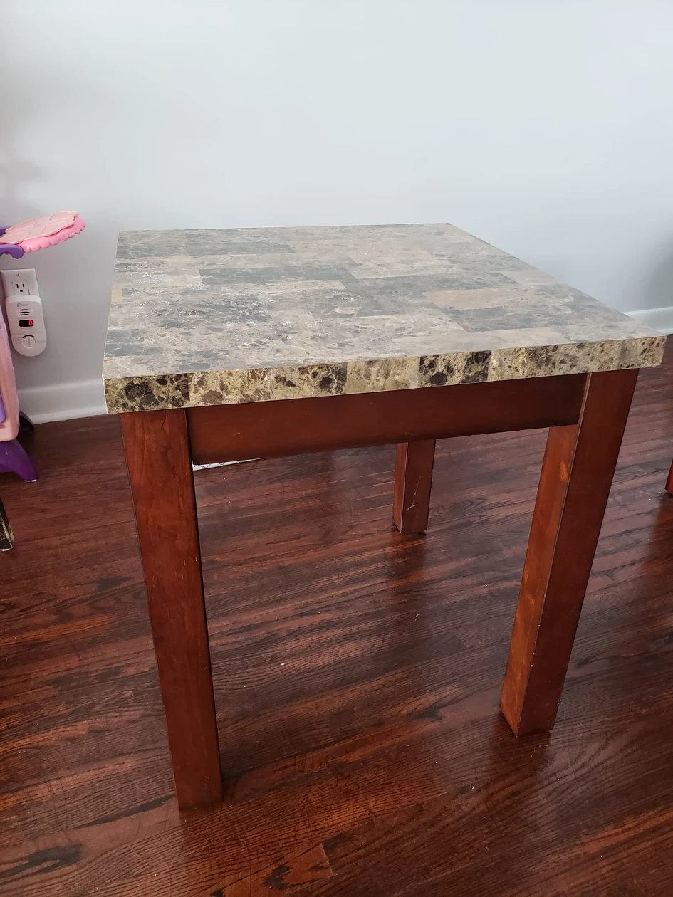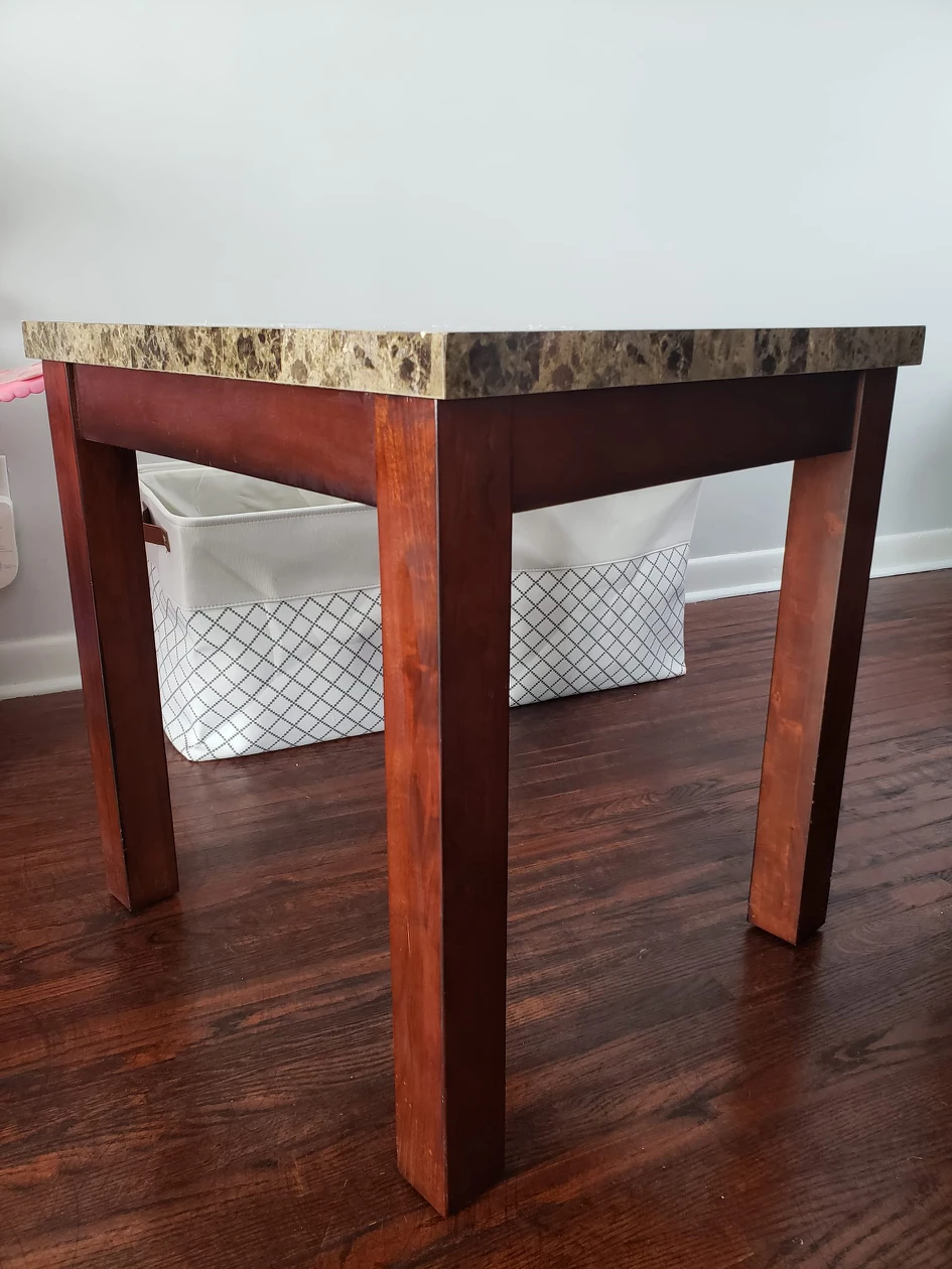 955Side table with Vinyl top in faux marble design with sturdy wooden legs. Used in fair condition. Many of my kids stickers were stuck on to the top of the table. Can be cleaned with adhesive cleaning products. Dimensions: table top - 61cm length x 56cm width x 3.5cm height table + legs - 61cm height Pick-up only in North York by Yonge & Cummer area/Silverview Park. PM for details.