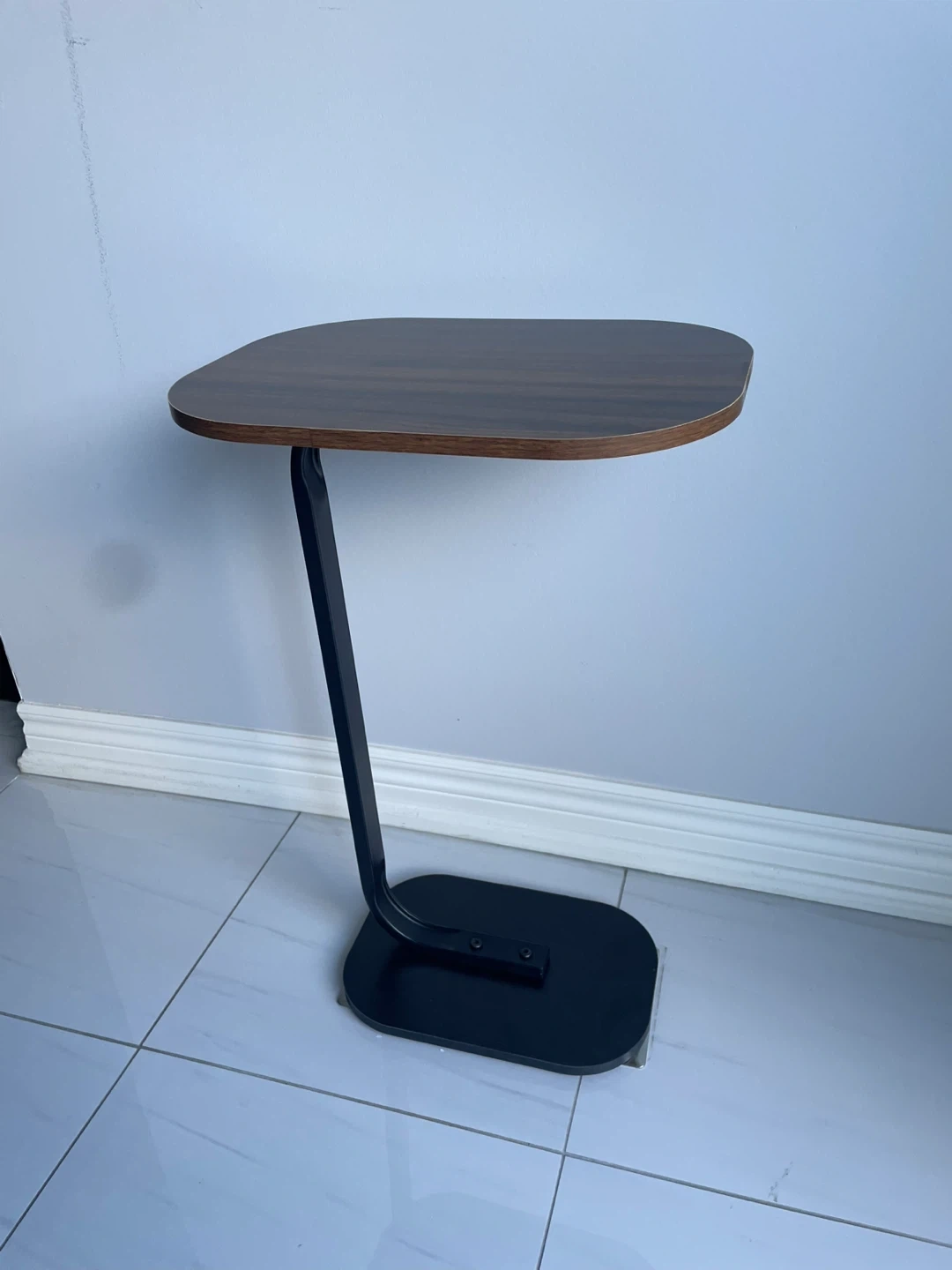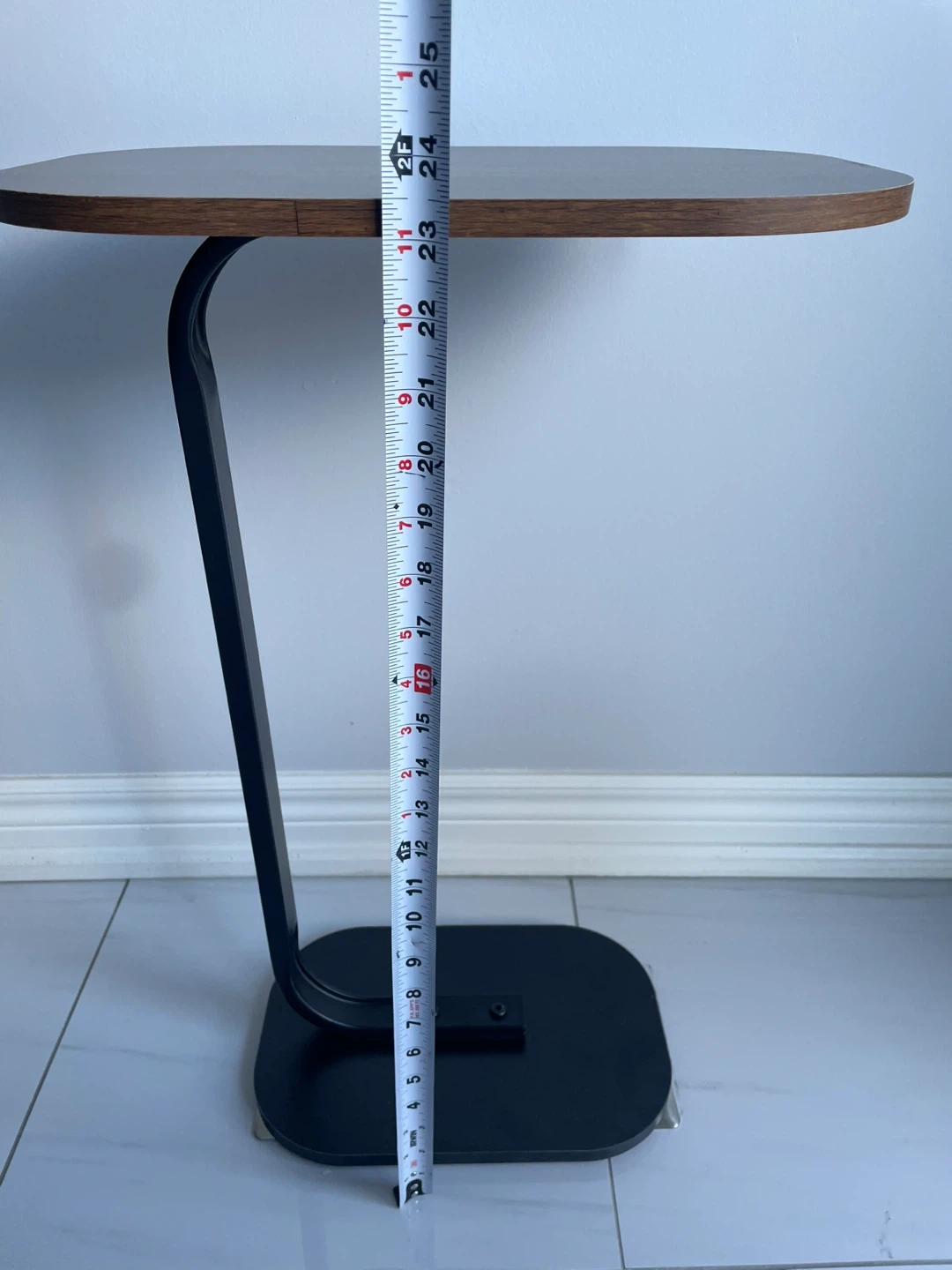 10Selling a stylish side table! It features a wood-look top and a sleek black metal base. The tabletop measures approximately 11 inches by 15.5 inches, and the table stands about 24 inches tall. Perfect for adding a touch of modern flair to your living space