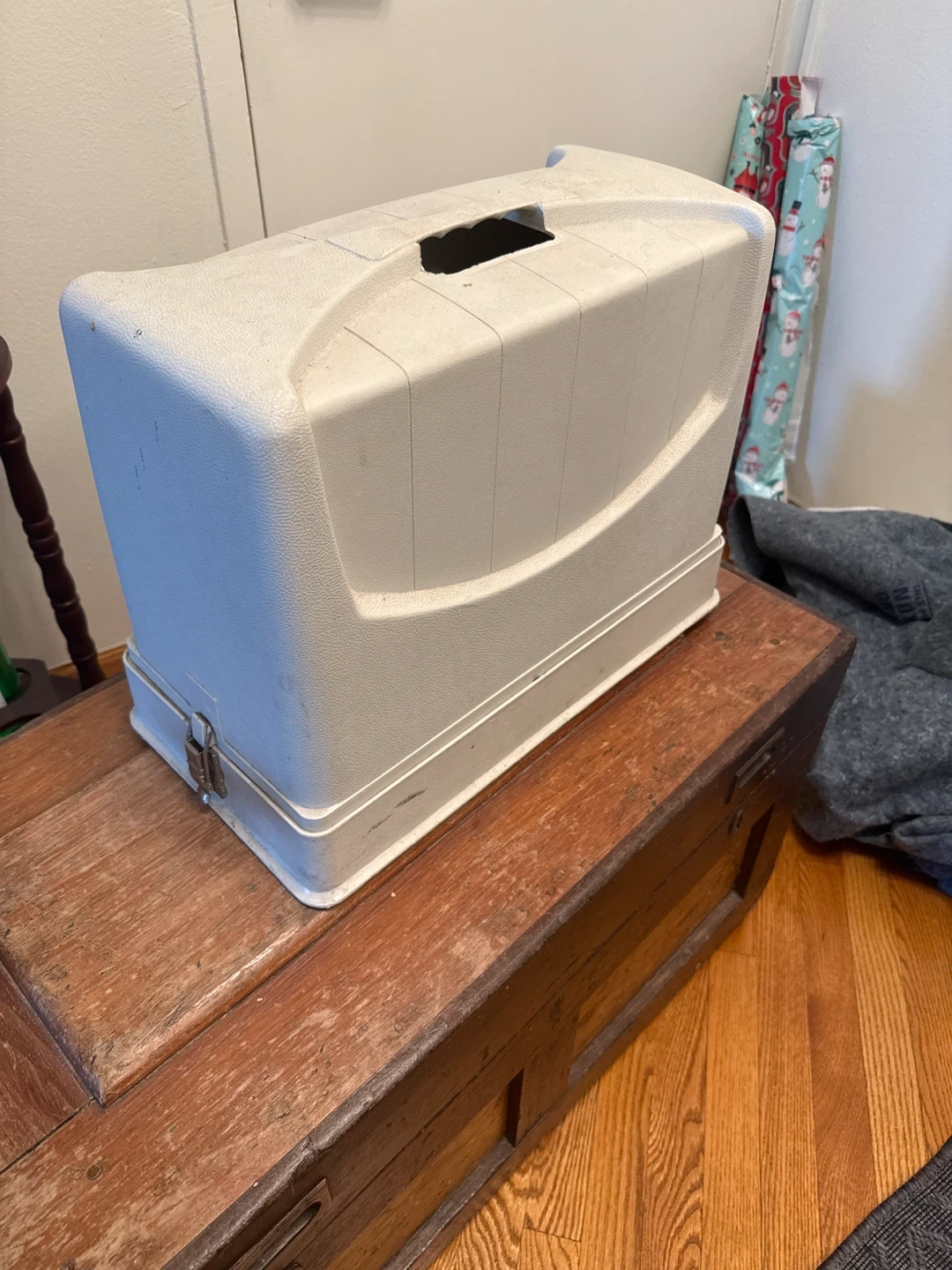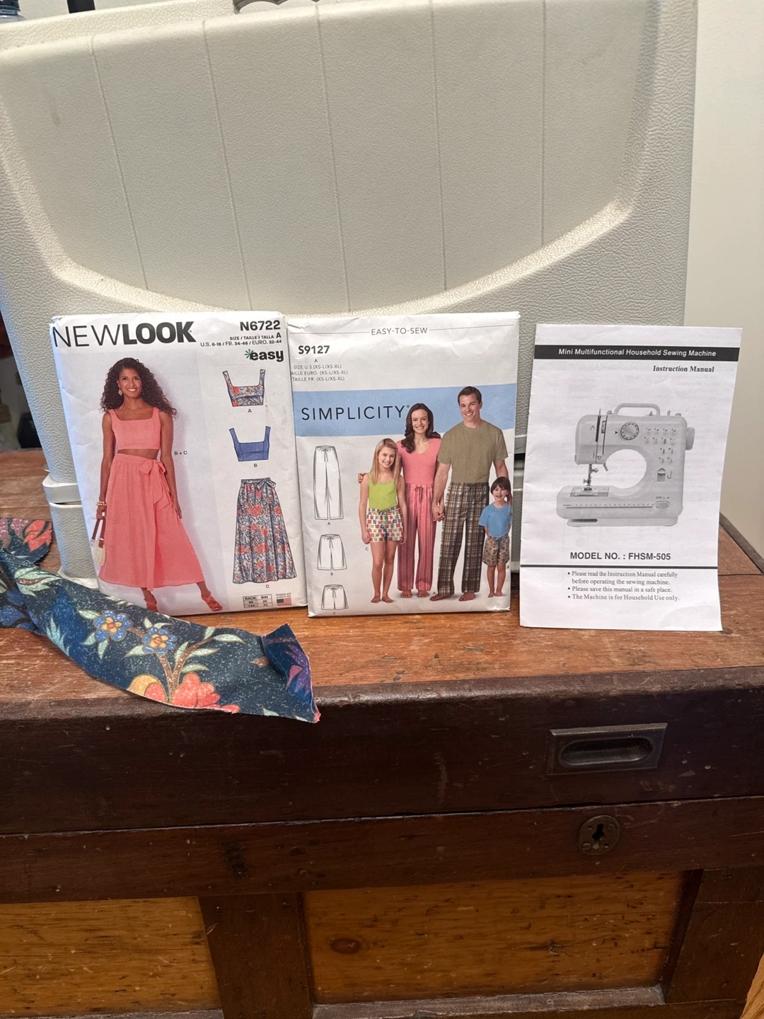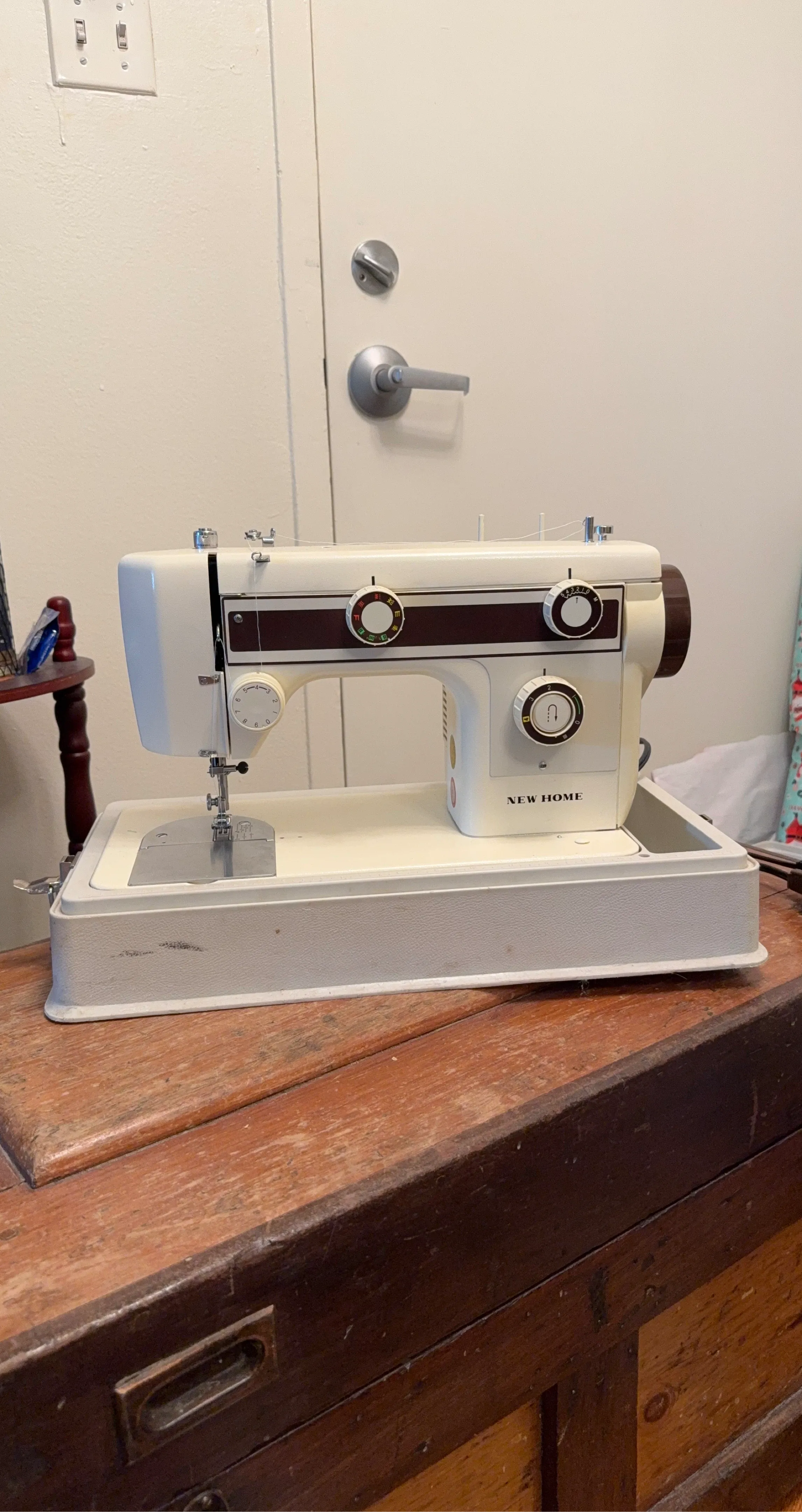 This is a vintage New Home sewing machine in its original case. It comes with sewing patterns from Simplicity and New Look, plus the instruction manual. A great find for any home sewer!