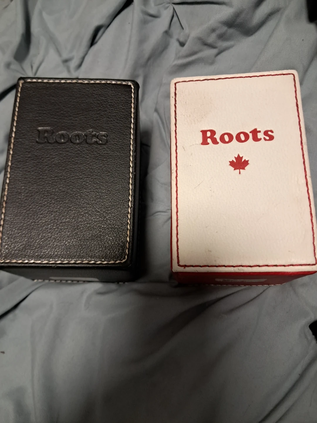 Two Roots women's leather cuff watches. Features a square face with a brown leather band. Both come in their original boxes with tags. These watches are a stylish accessory for everyday wear.