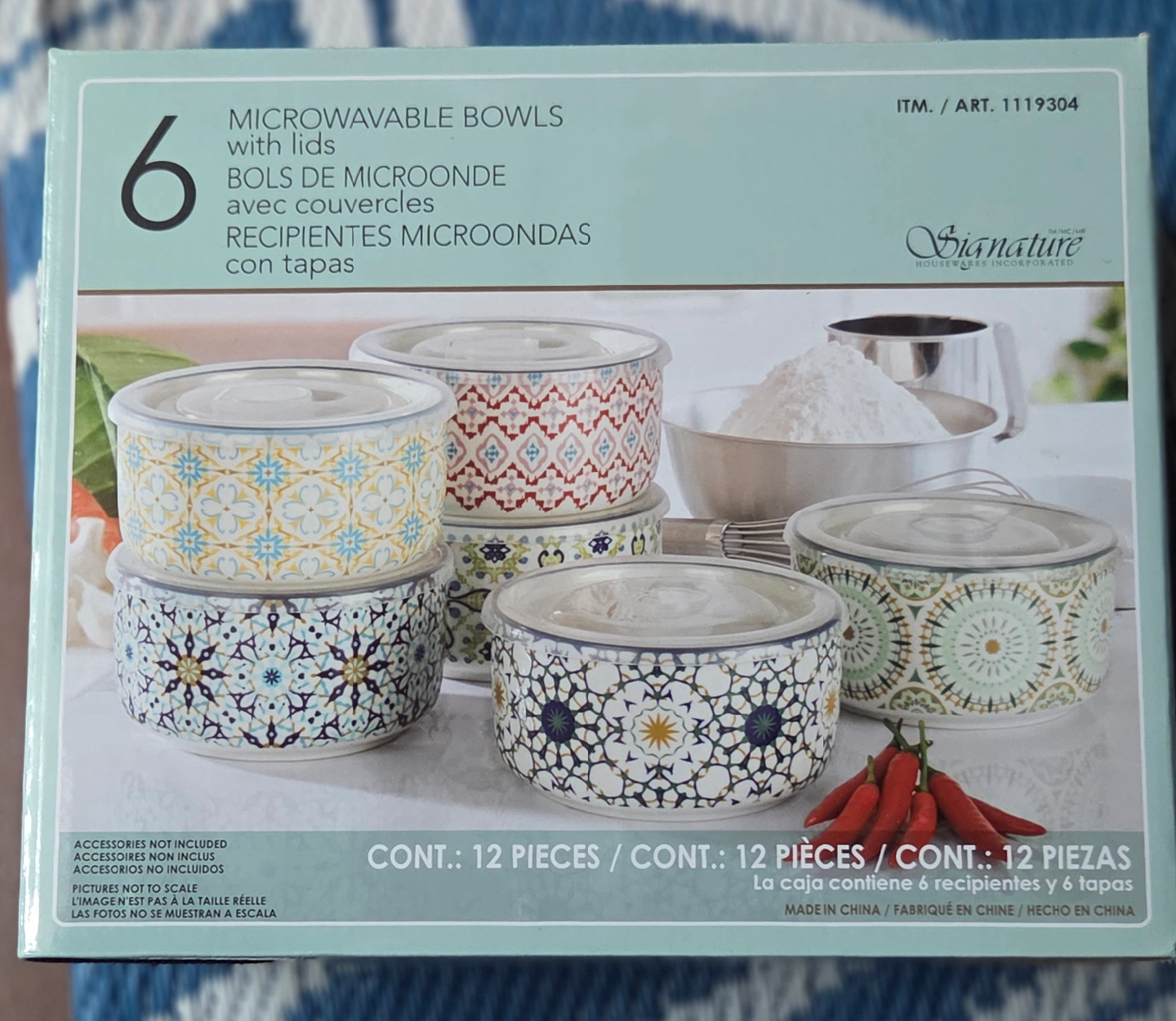 Selling a set of 6 Signature Housewares microwavable bowls with lids! These bowls are perfect for storing and reheating leftovers. The box contains 6 bowls and 6 lids, making a total of 12 pieces. They have a nice decorative pattern on them