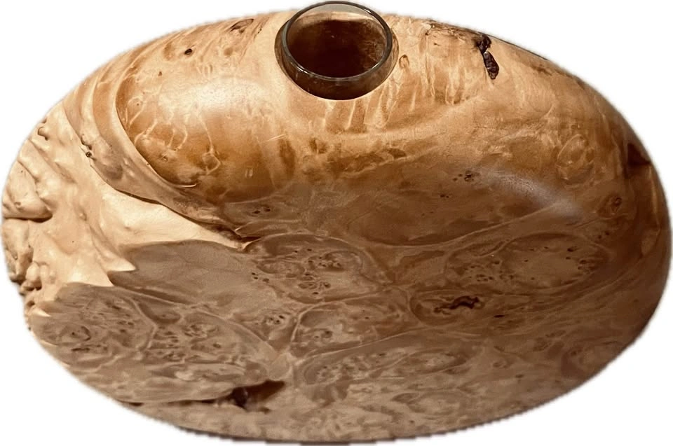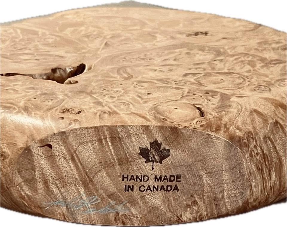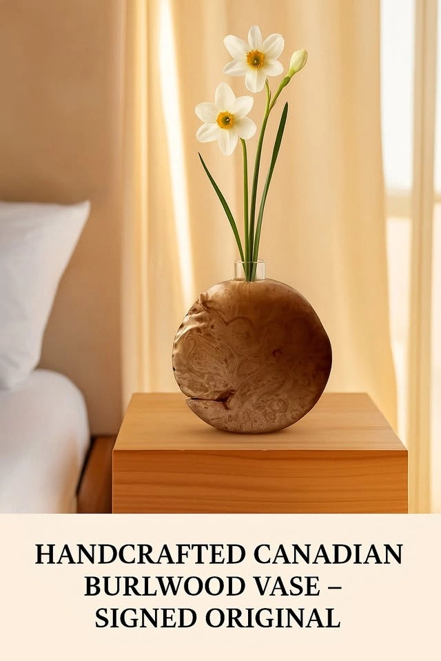 Bring a touch of Canadian artistry into your home with this stunning handmade burlwood bud vase. Expertly crafted and signed by the artist, this unique piece features a smooth round burlwood body that showcases the natural swirls, knots, and rich character only burlwood can offer. The vase includes a removable glass insert, making it both beautiful and functional for displaying fresh or dried flowers. Its organic form and natural imperfections give it warmth, elegance, and timeless appeal — no two pieces are ever alike. • Material: Canadian Burlwood with glass insert • Size: Approx. 8” tall × 3” wide • Origin: Handmade in Canada, signed by artist • Condition: Excellent vintage/used condition with beautiful natural grain Perfect for collectors of Canadian artisan crafts, lovers of natural wood décor, or anyone looking for a statement accent piece that’s truly one-of-a-kind. Selling for $50 OBO Pickup: Oakville, ON